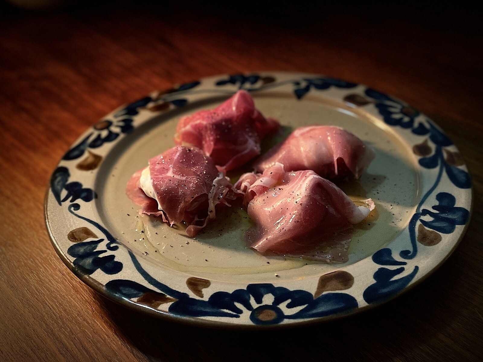 2. 生ハムを被せ、たっぷりのオリーブオイルをかけて黒胡椒を少しかけたら完成!