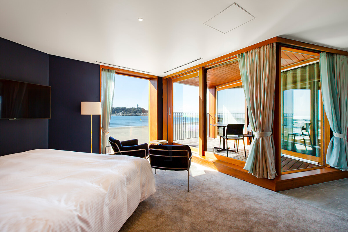 客室以外にも、大きなソファーを設えたライブラリースペースやルーフトップテラスと、湘南の海と江の島という最高の眺めを楽しみながら、ゆったりと過ごせるスペースも。