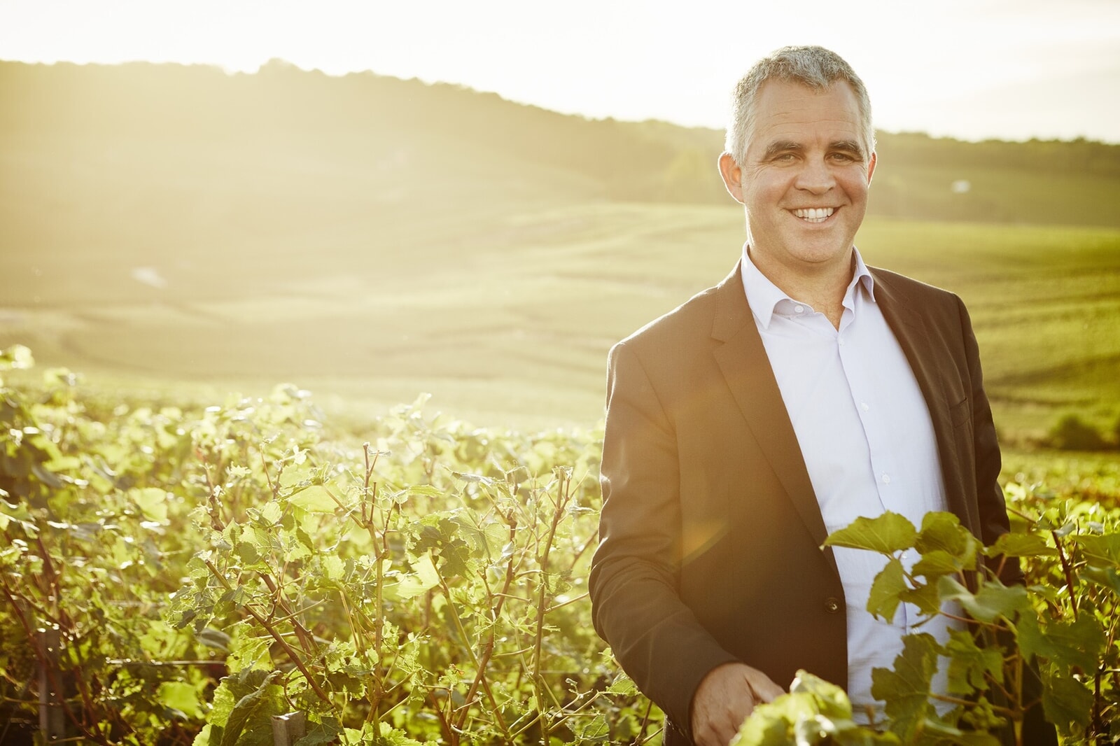 クリュッグの自社ブドウ畑に立つ6代目当主、オリヴィエ・クリュッグ。1989年にクリュッグに入社。父である5代目アンリ・クリュッグの命で来日、当時まだ日本では有名ではなかったクリュッグの販路を切り拓き、その人気を不動のものとした立役者。日本をこよなく愛している。テイスティング委員会のメンバーでもあり、ワイン醸造チームとともにクリュッグの魅力を世界に伝えている。