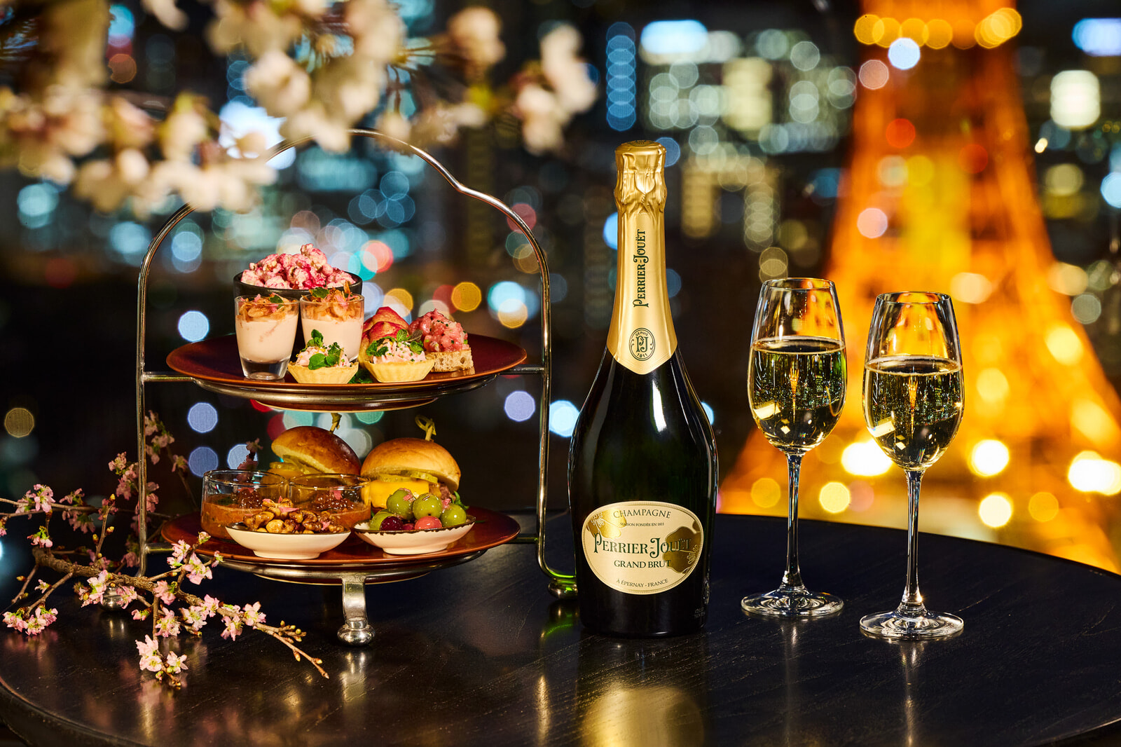 満開の桜と高層ビルの夜景を眺めながらいただくペリエ ジュエ グラン ブリュットは格別なもの。心に残る”桜の宴”を約束してくれるに違いない。