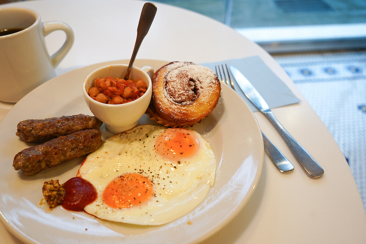 モーニングプレートのパンはシナモンロールかベーグル、卵は目玉焼きかスクランブルエッグ、お肉は自家製ソーセージとローストチキンから選べる。