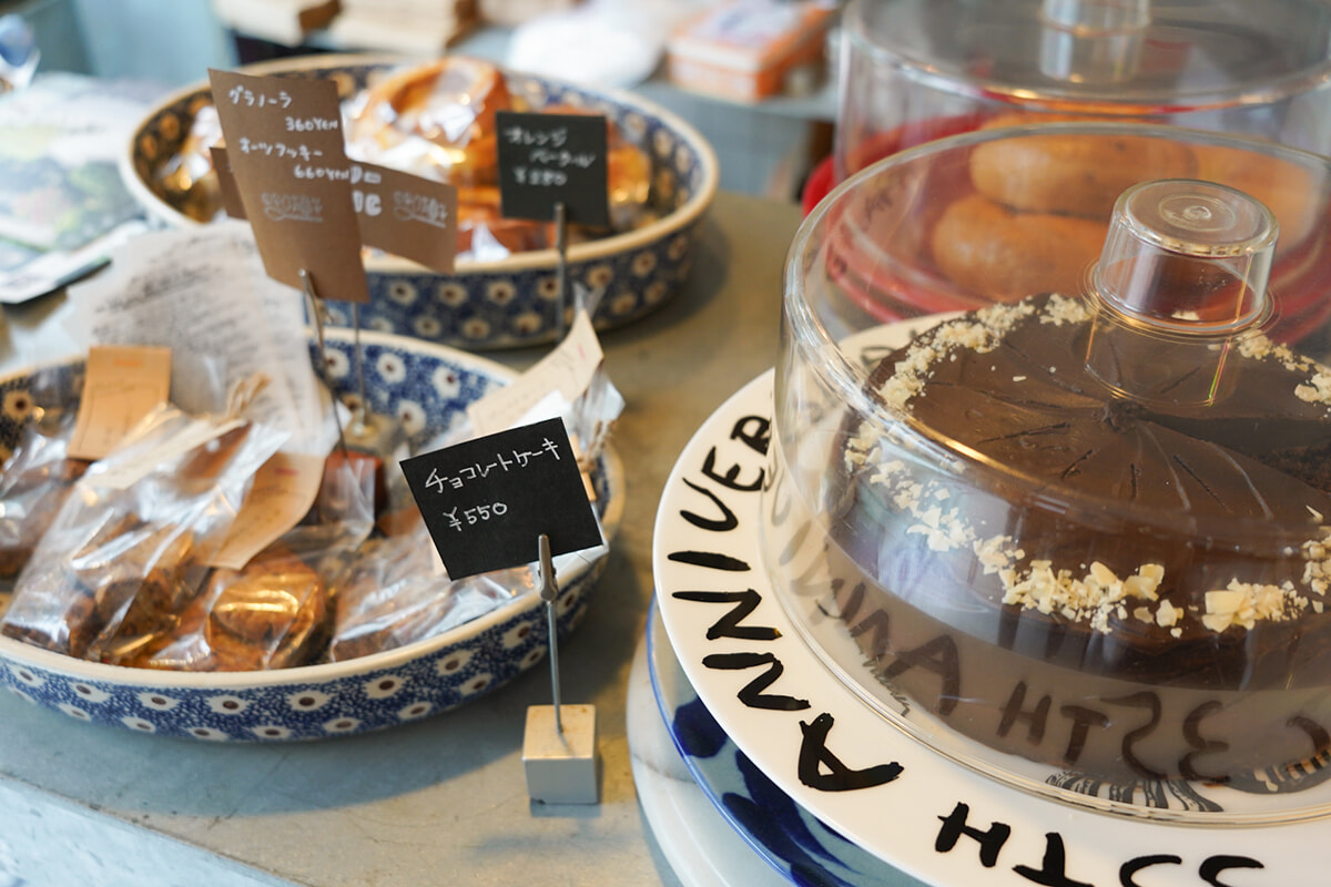 店頭のショーケースには朝焼いたばかりのパンやホームメイドのケーキなどが並ぶ。