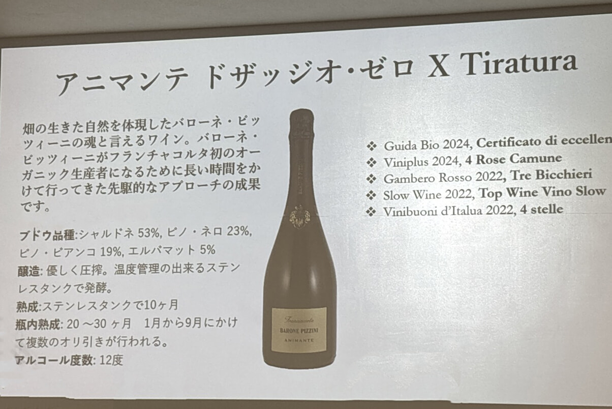 そんなバローネ・ピッツィーニがエルバマットを使用した意欲的なシリーズが「アニマンテ」だが、2024年リリースのものからドサッジョゼロに切り替えていくことを発表! 追加の糖分を補完しない分、ブドウの果実味がとても重要視される造り方に舵を切ったのだから、自分達の技術力と、オーガニック栽培にこだわるブドウのポテンシャルにどれだけの自信を持っているかがわかるというもの。華やかさの中に、ピノ・ビアンコから湧き立つようなフルーティさがあり、キリッとした酸味と力強いミネラル感で余韻が引き締まる。トロやサーモン、ホタテといった味わい深い寿司と合わせてみたくなるような味わいだ。