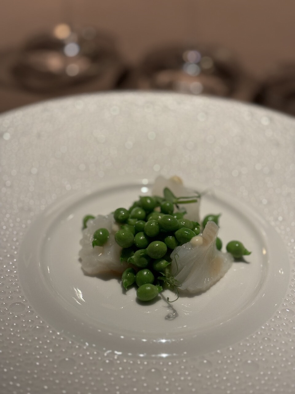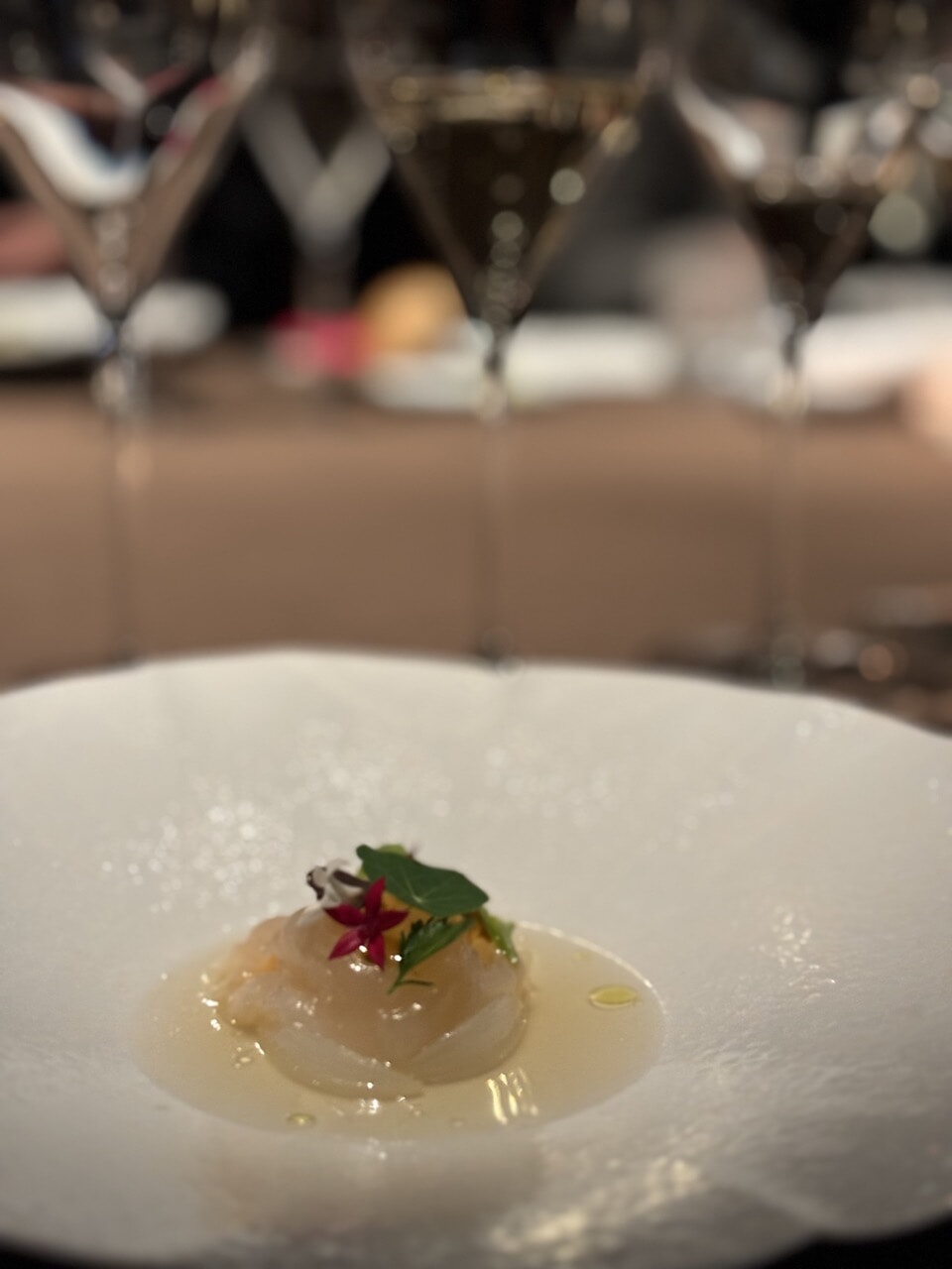 フランチャコルタは山間に位置するというのに、そのミネラル感とフレッシュな酸味は海鮮系の魚介とも好相性だ。コースの最初には透き通るようなアオリイカにグリーンピースを添えたひと皿が供された。それに合わせてサービスされたのが、名門ワイナリーであるリッチ・クルバストロのサテンブリュットだ。