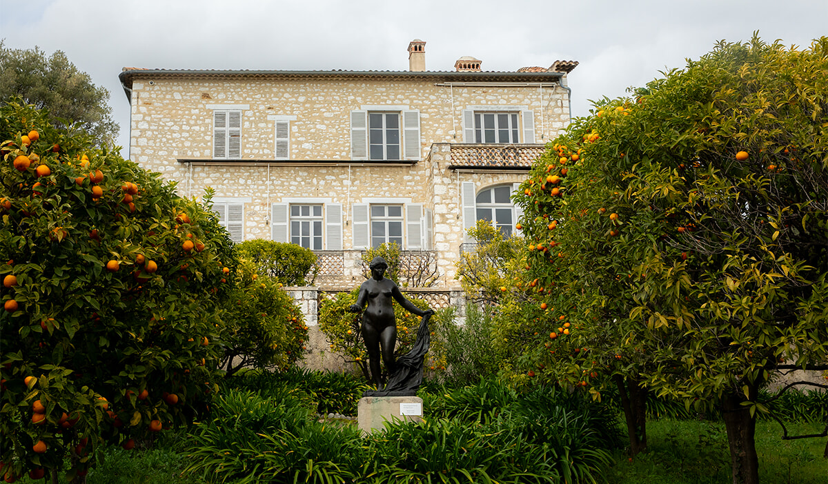 柑橘樹に囲まれた『勝利のヴィーナス』像の向こうに家がある。ルノワールは、彫刻家リシャール・ギノやルイ・モレルの協力を得て、ここで彫刻を始めた。