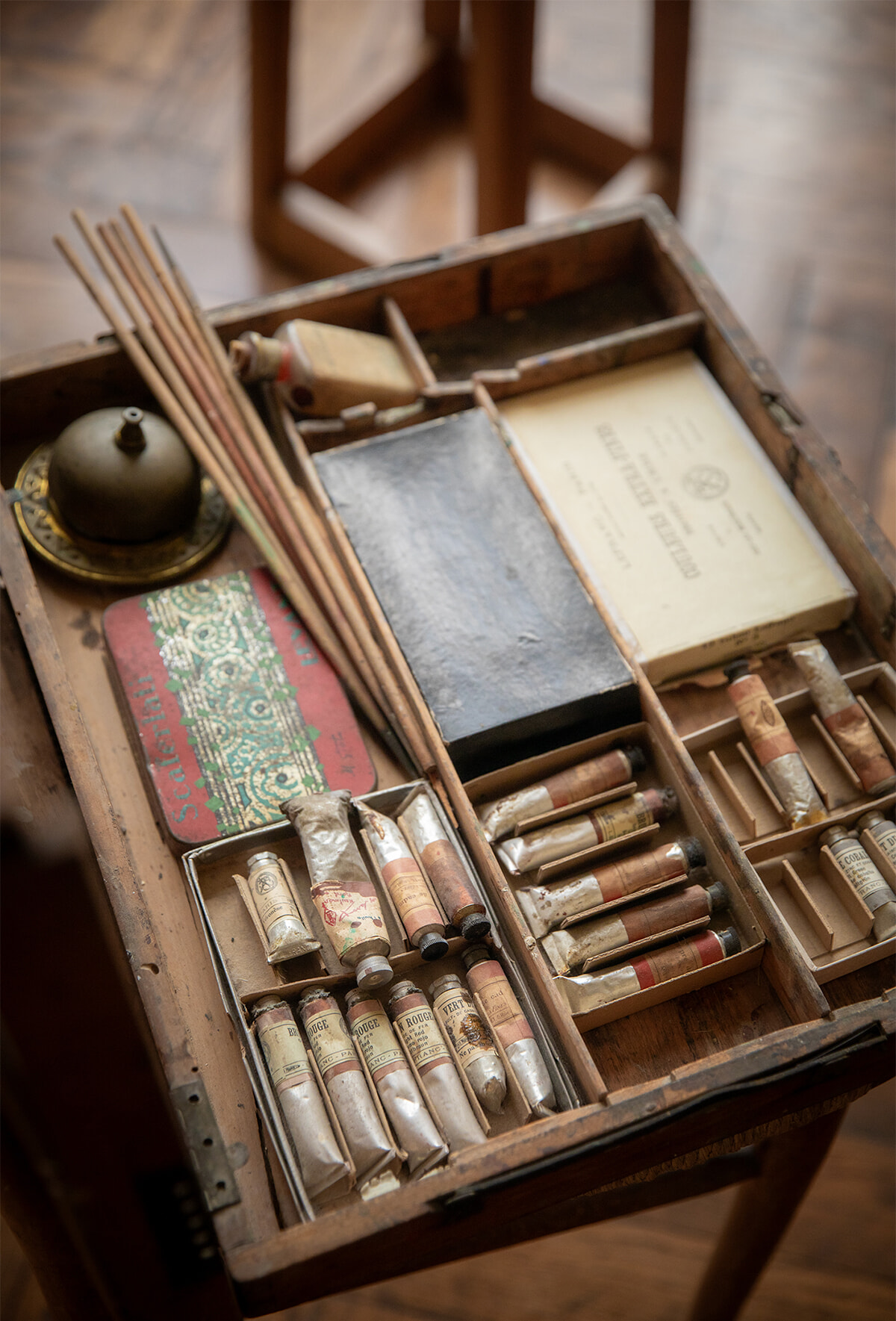 イーゼルの脇に残されたルノワールの絵の具や筆、パレットなど。