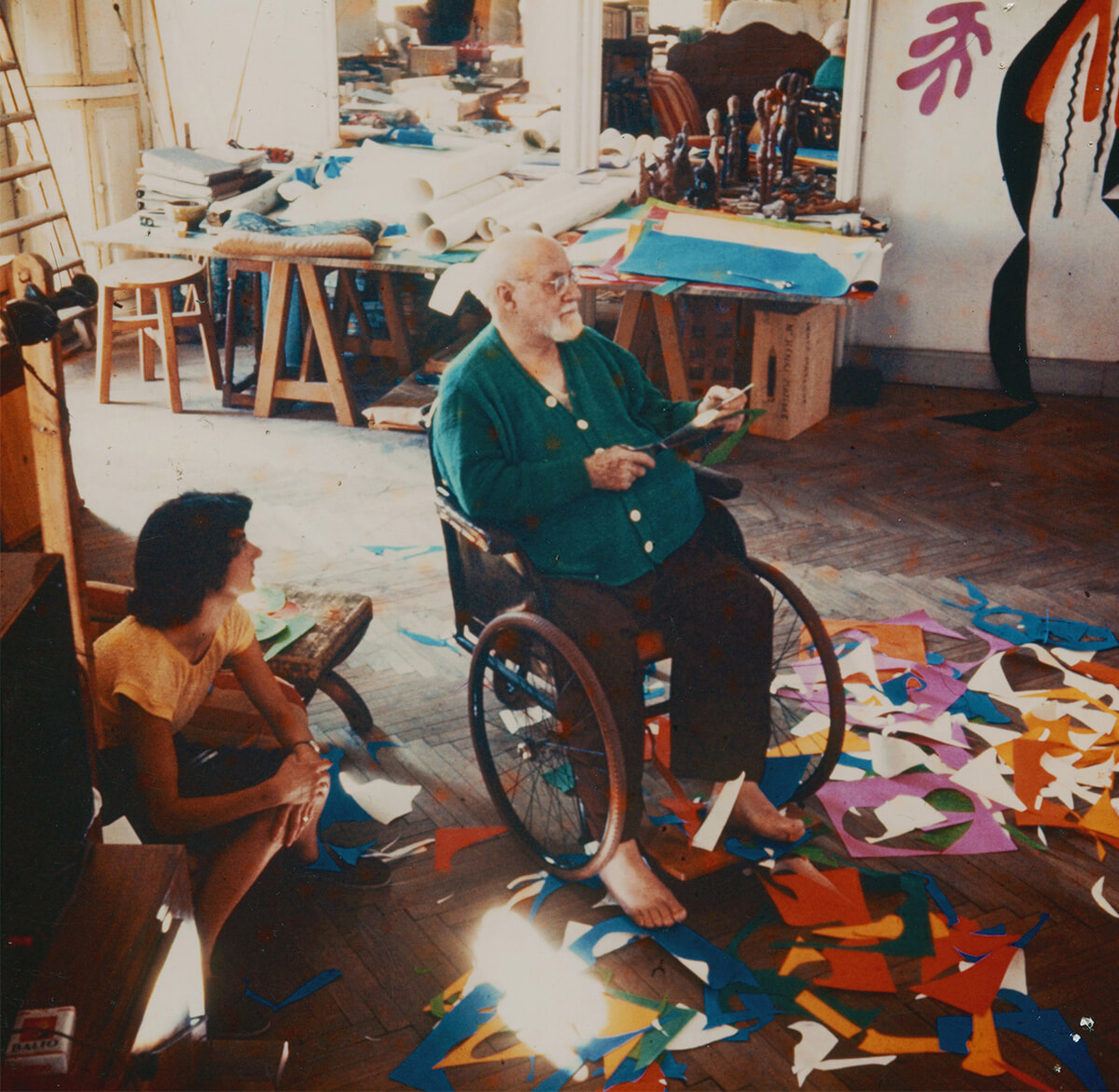 マティスは、1917年の冬から54年に亡くなるまでニースに暮らした。52年頃、切り紙絵の制作中。