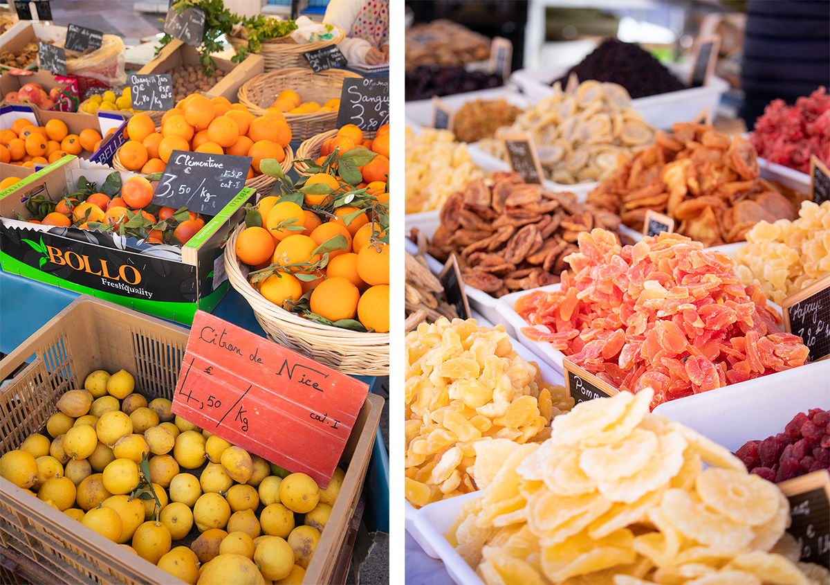 左:市場を彩る果物の中に、ニース産のレモンを発見。 右:花、野菜や果物、ハーブや石けん、ドライフルーツなども色とりどりに並ぶ。