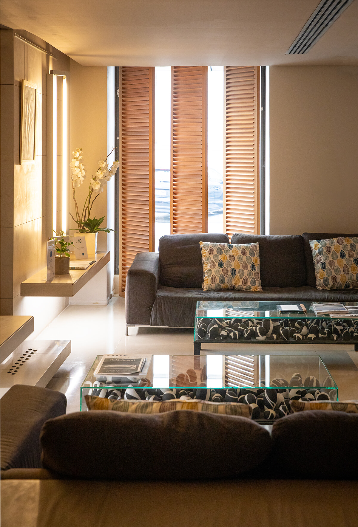 大きなソファのあるロビー。1階には明るい朝食ルームとバーもある。