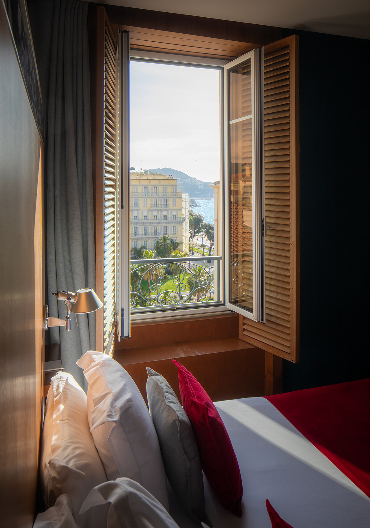 木製の日除けが南仏らしい、スタンダードルームの531号室。館内にはマティスの絵の複製を飾っている客室もある。