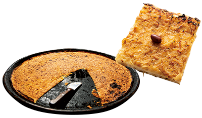 左:大きな円形の鍋ごと自転車で市場に運ばれてくる「Socca」は、特製ナイフで切り分けてサーブ。どんどんお腹に入ってしまう。1人前3ユーロ 右:ニース名物「Pissaladière」1切れ3ユーロ