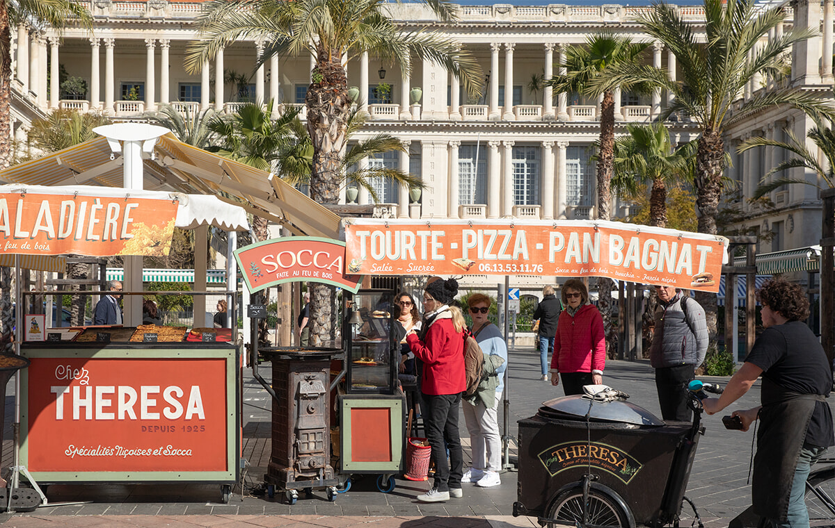 ニース伝統のストリートフード、ソッカはヒヨコ豆の粉とオリーブオイルでできたクレープのようなもの。旧市街の店の窯で焼いて、市場にあるこの屋台まで自転車で配達。フダンソウのタルトや、玉ネギのスライスとアンチョビ、オリーブをのせた名物のピサラディエールなど、どれも試したくなる。