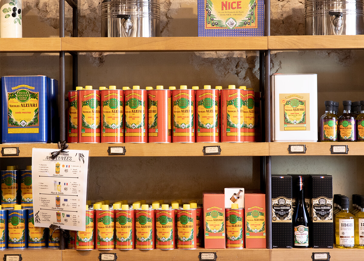 欧州産オリーブをブレンドした青い缶が有名な老舗。店内ではほかに2種のオイル、オリーブの実の量り売り、タプナード、さらには地元産の果物のジャムなどの食材がずらりと並ぶ。オリーブの木のサラダサーバーなど、雑貨も充実。本店に来たら、自社の畑で栽培するニース産オリーブをぜひお土産に。