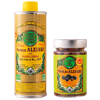 左:黄色の缶は「セザール」。カンヌからマントンまでの42kmにわたるエリアで栽培されるオリーブだけに許される原産地呼称、オリーヴ・ドゥ・ニースのオイル。250ml 9.20ユーロ 右:カイエットと呼ばれる小粒で黒いオリーヴ・ドゥ・ニースの瓶詰め。アペリティフにどうぞ。125g 6.90ユーロ