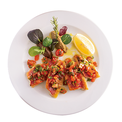 ヒメジのプランチャ、グリーン&ブラックタプナード添え。「Filet de Rougets Cuit à la Plancha, Sauce Vierge et Tapenade Verte et Noire」25ユーロ