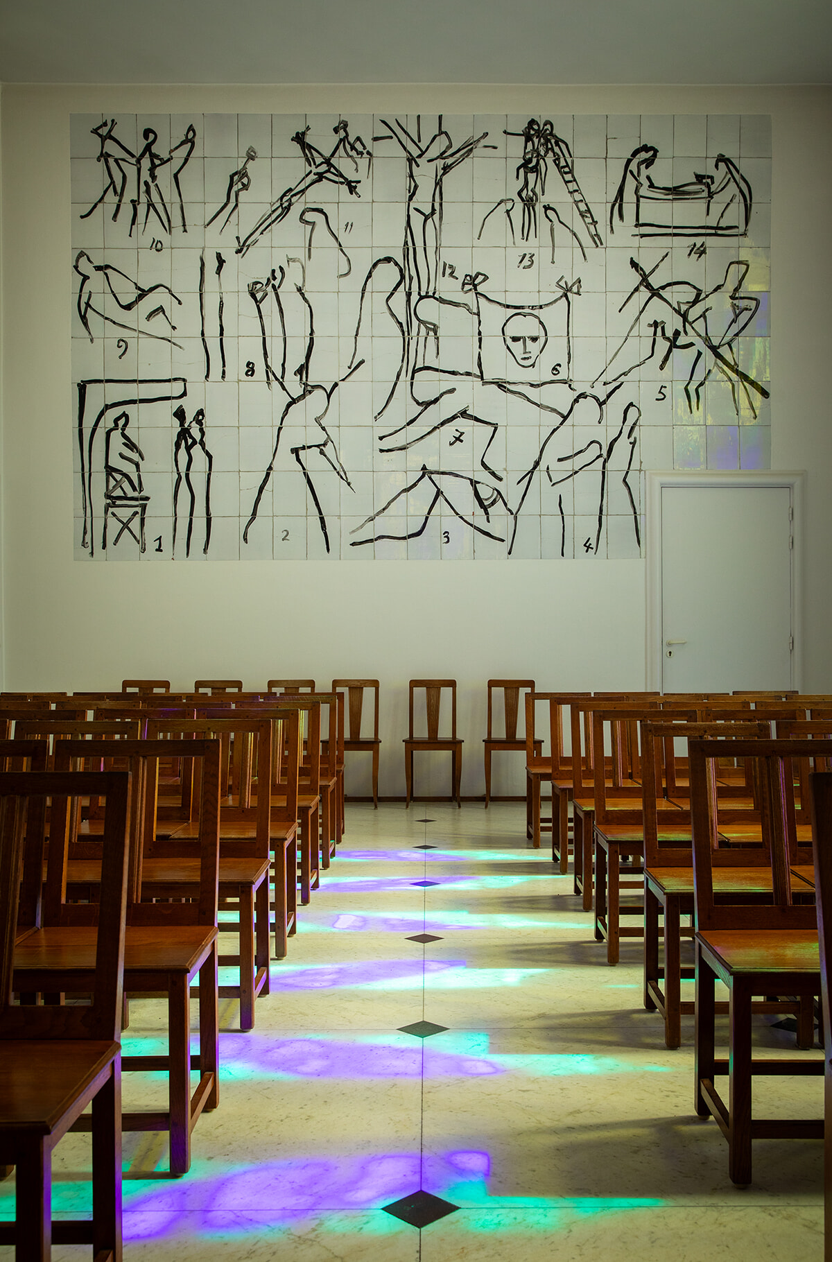 晴れわたった空から降り注ぐ光が、白い礼拝堂を青、黄、緑に染める。当初は赤をイメージして試作もしたが「地獄のようだ」と言って、変更したという逸話も。