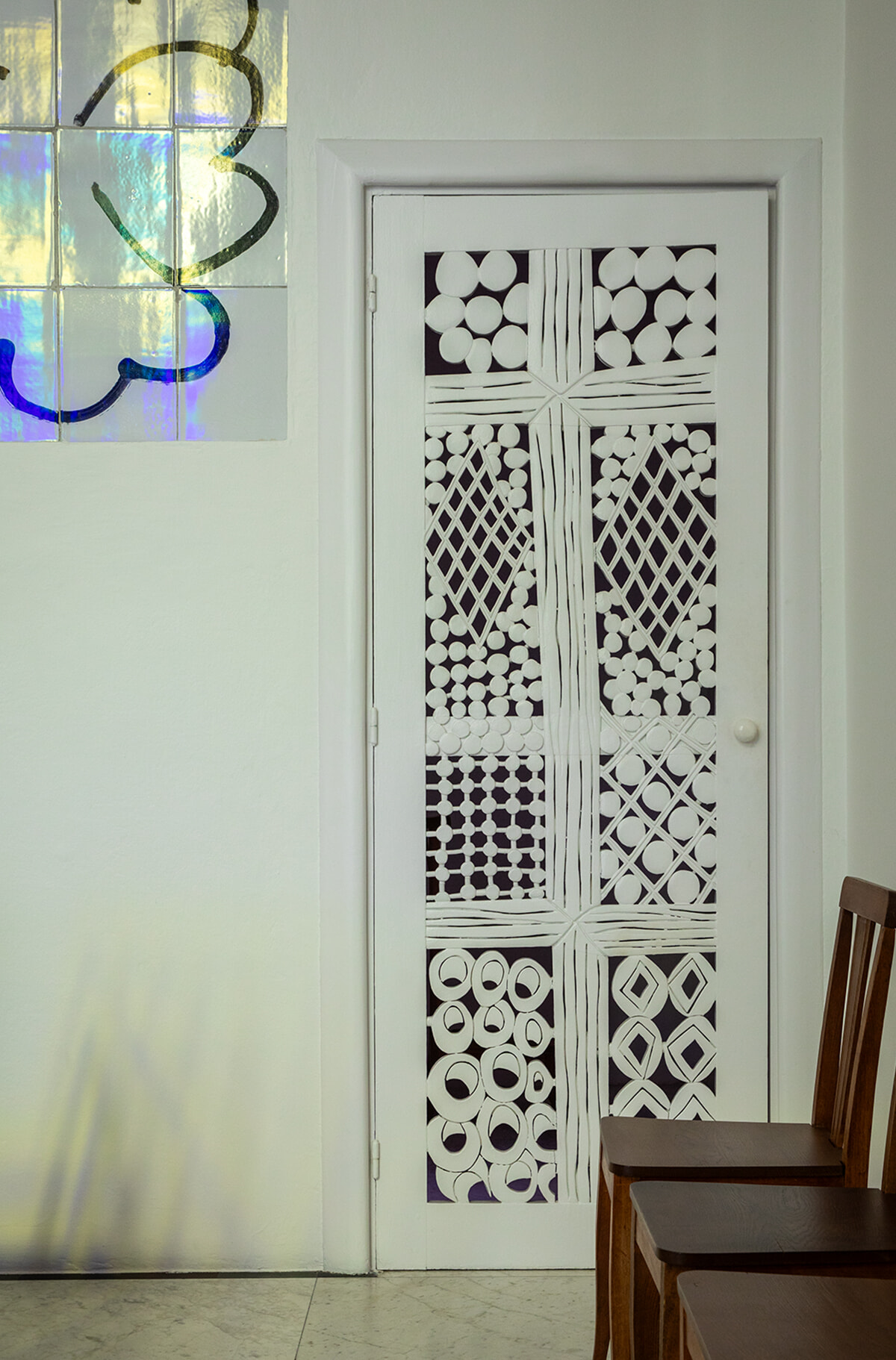 懺悔室に向かう透かし彫りのドアは、モロッコの透かし窓を思わせる。