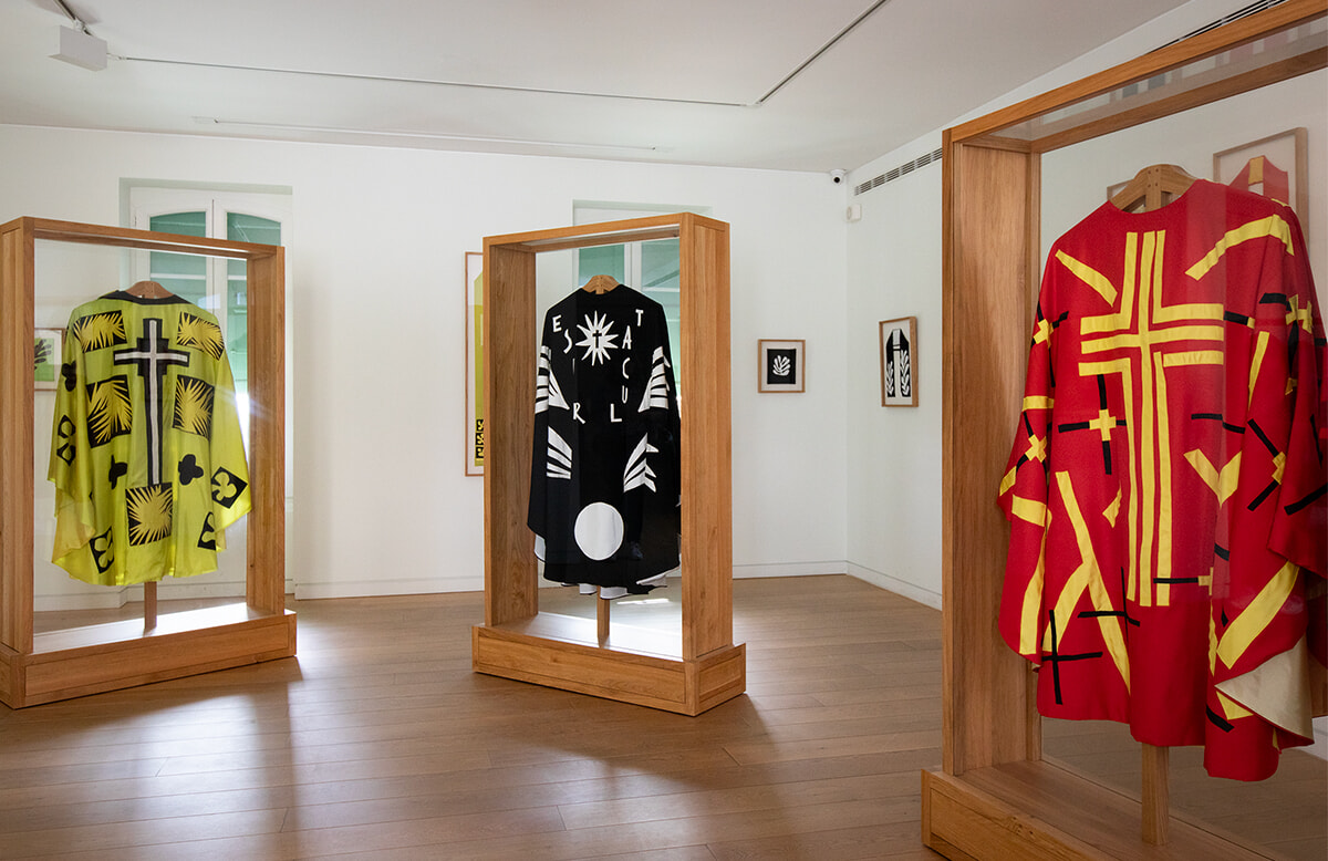 1941年にがんの手術を受けた折、看病した修道女たちへの感謝の印として、マティスが望んだのが礼拝堂の建設だった。建築好きの修道士が図面をひき、ステンドグラスやタイルの壁画、祭壇のキリスト像や燭台、懺悔室、そして神父の祭服も制作。4年の歳月をかけて打ち込んだ礼拝堂は、画家自らが「我が人生の傑作、真実の追求に捧げた人生の結論」とする総合アートだ。隣接する美術館では、オリジナルの図面やタイルに描かれた壁画のための習作などのほか、動画で礼拝堂の歴史と建設の過程を解説。神父の祭服も展示されている。