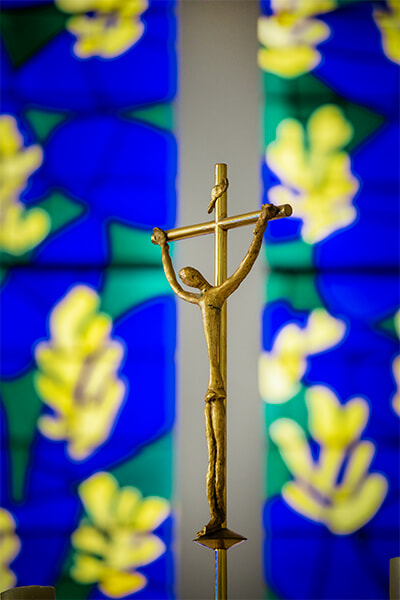 祭壇の上のキリスト像もマティス作。ジャコメッティの影響を受けたといわれる細長いシルエット。