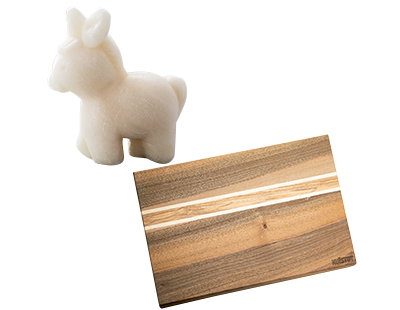 左:自家飼育のロバのミルクで作られたオーガニック石けん。近隣のトゥーレット・シュル・ルーから。17.50ユーロ 右:ヴァンスの作家が発信するクルミ材のプレート。クルミ、レッドハート、カエデ、黒檀の組み合わせ。109ユーロ