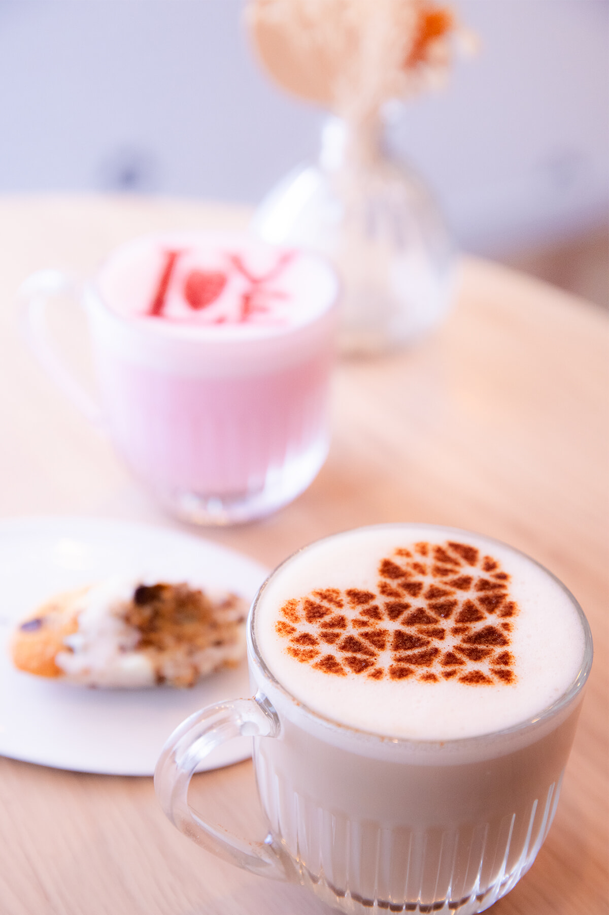 手前から「Cappuccino」4.50 ユーロ、ビーツ入りの「Pink Chai Latte」5.50 ユーロ。「Madeleine」マドレーヌ2.50ユーロ