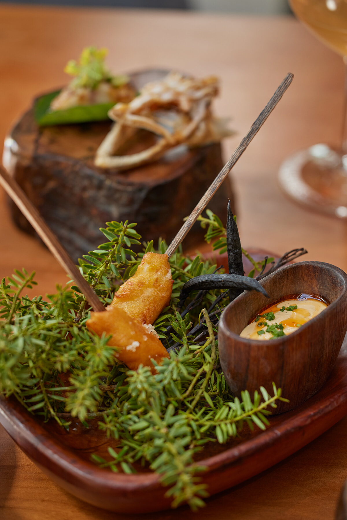 アヒの人気メニュー「Scampi Corn Dog」(時価)。オークランド近海で獲れたスカンピをアメリカンドッグに見立て、マヨネーズソースでいただく。