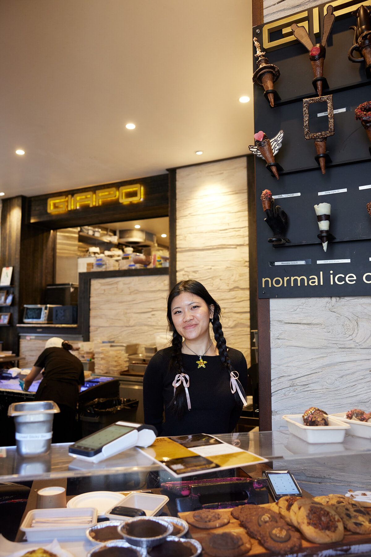 オーガニックな素材、可能な限り地元産の食材を使うというのが信条だ。アイスクリームのフレーバーは旬に合わせて入れ替わりはあるが、約10種類が揃う。そこに合わせるコーンもフォトフレーム型、指にはめられる”ウェアラブルコーン”など形さまざま。アイスクリームってこんなに自由だったのか!と、愉快で伸びやかな気持ちをもたらしてくれる。