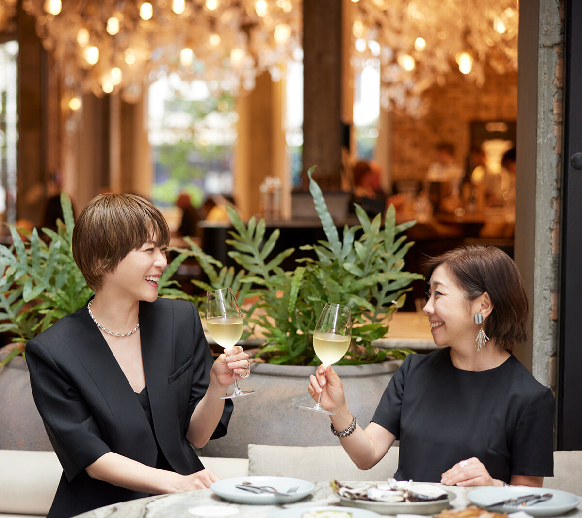 (上野)ジャケット¥86,900、ジャンプスーツ¥75,900/ともにアキラナカ(ハルミ ショールーム) ネックレス¥148,500/ジョージ ジェンセン(ジョージ ジェンセン ジャパン) 小指のリング¥39,600/コールムーン(ショールーム セッション) その他本人私物