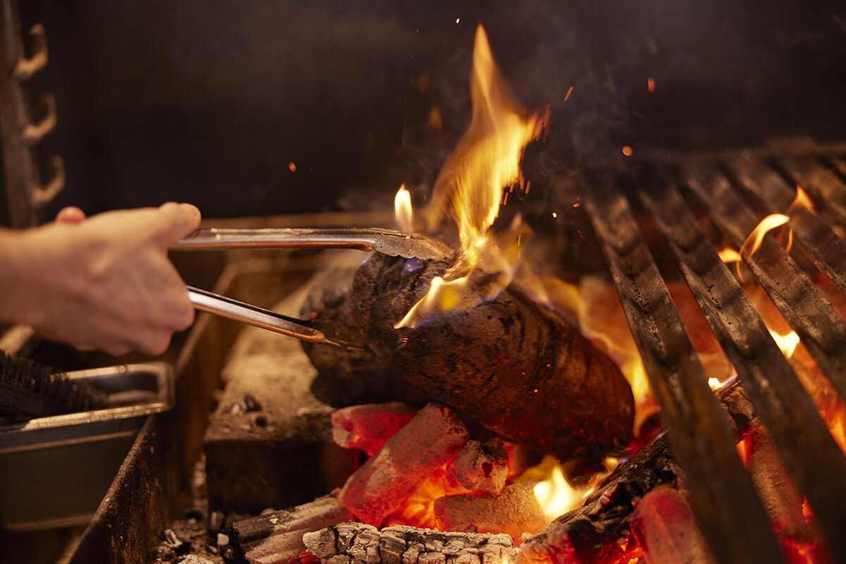アヒ流ハンギはグリルで火入れして仕上げる。塩釜のように肉を土で包んで蒸し焼きすることで、自らの脂でスチームされほどよい旨味に。
