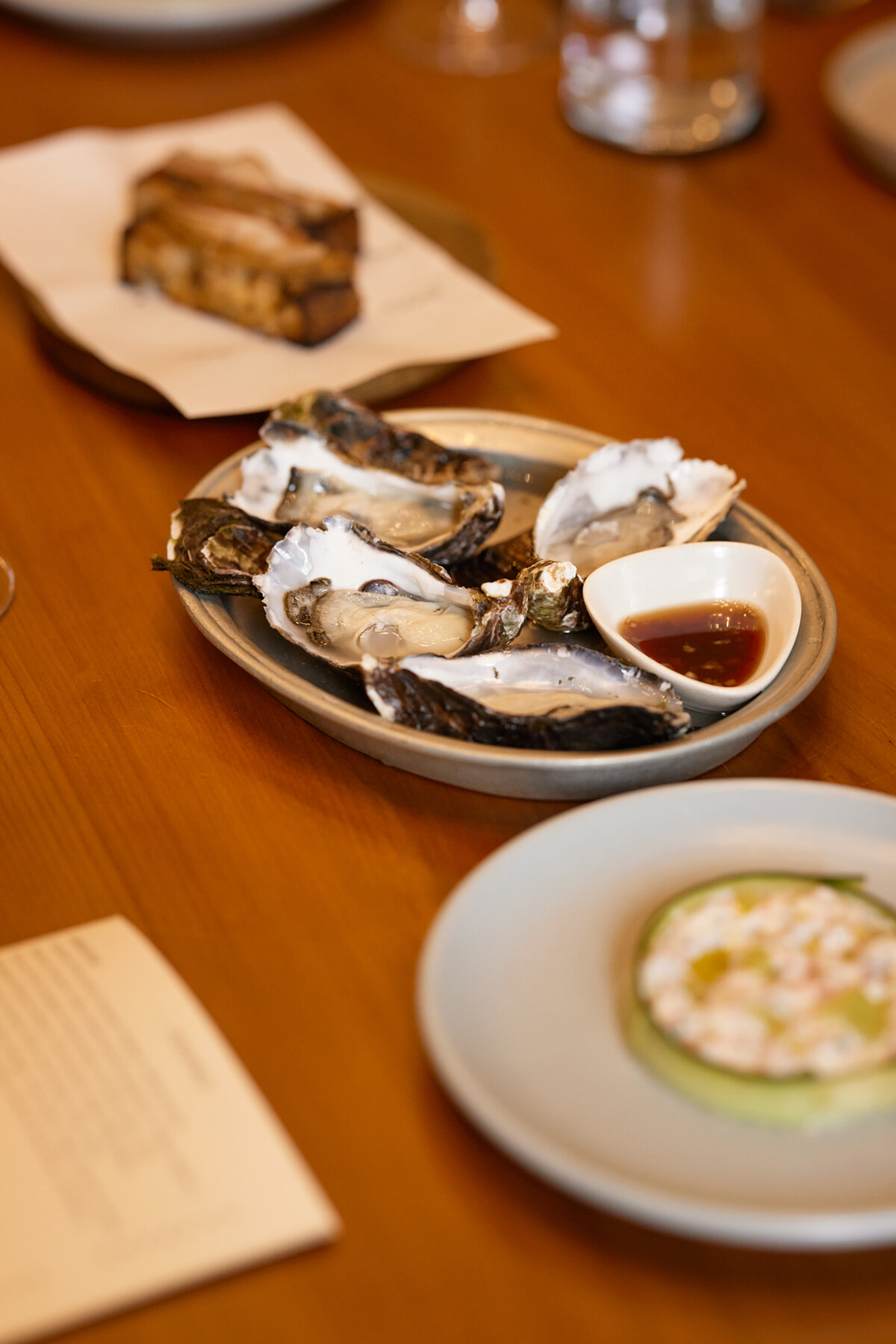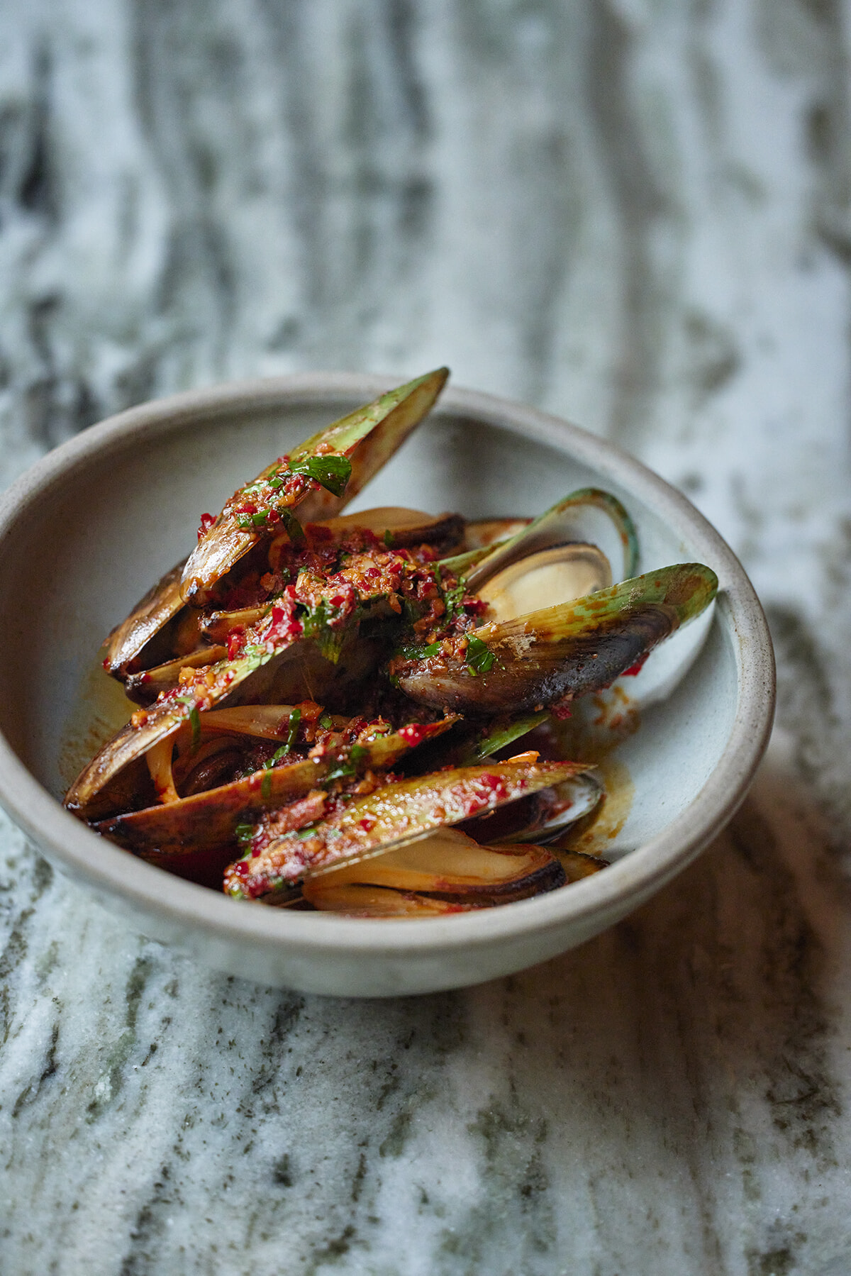 この店でぜひ味わいたいのは、固有種である「グリーン・マッスル」と呼ばれるムール貝。名前のとおり緑色に光る殻と、大ぶりの身が特徴だ。キンギでは、辛味のあるサラミのペースト、ンドゥイヤと合わせている。「ニュージーランドの海産物はどれもレベルが高いけれど、このグリーンマッスルは必食ね!」とすすめる平野。上野も「ソースやスパイス使いが上手で、真似したくなる」と気に入った様子。