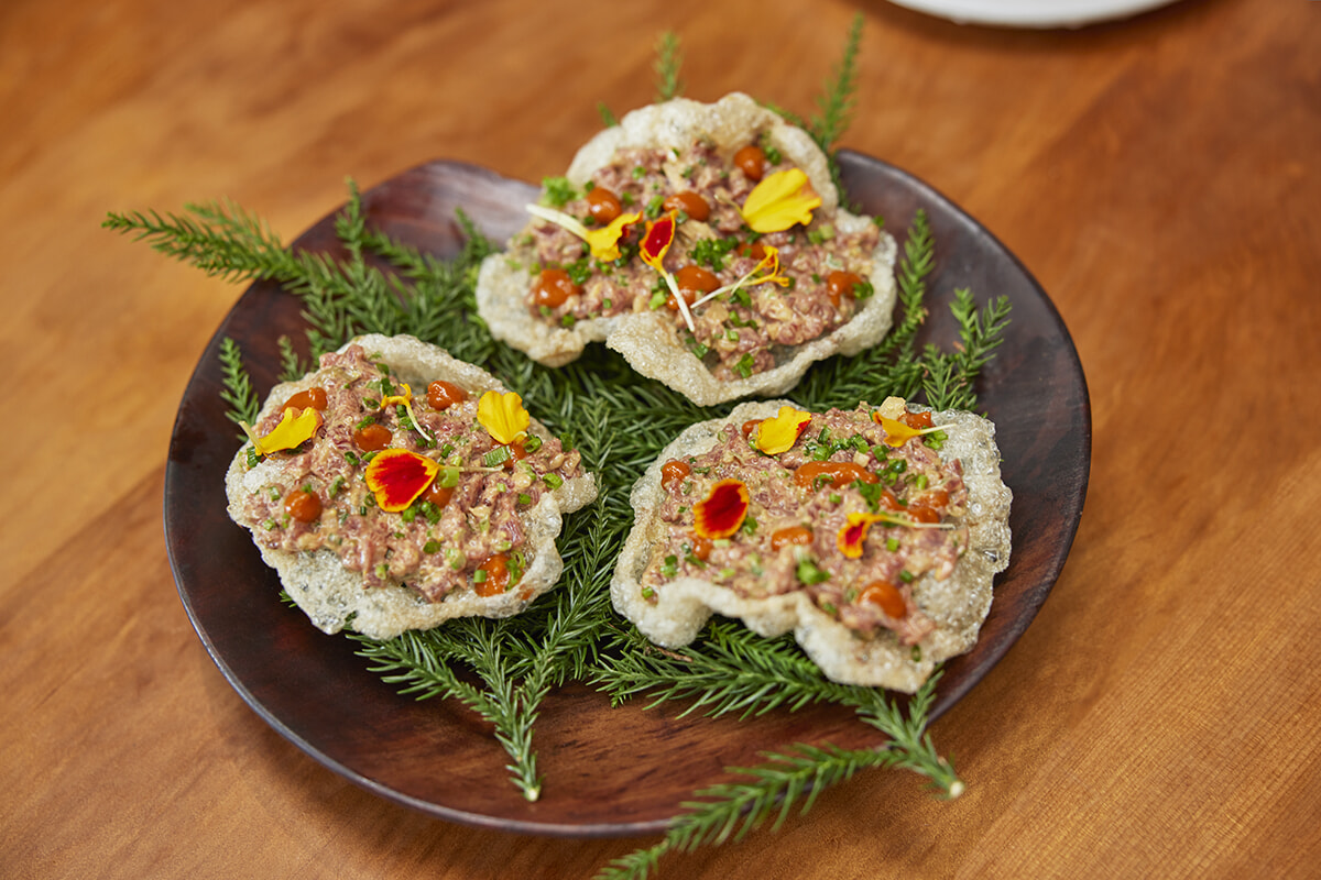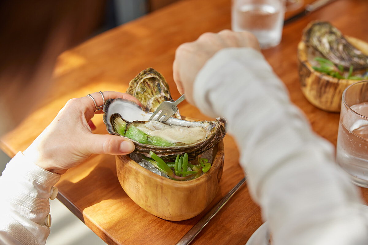 オールデイで楽しめるダイニング「キンギ」は、新鮮なシーフードが自慢。地元漁師と協力し、サステイナブルな漁法で調達した素材で、メニューを提供する。