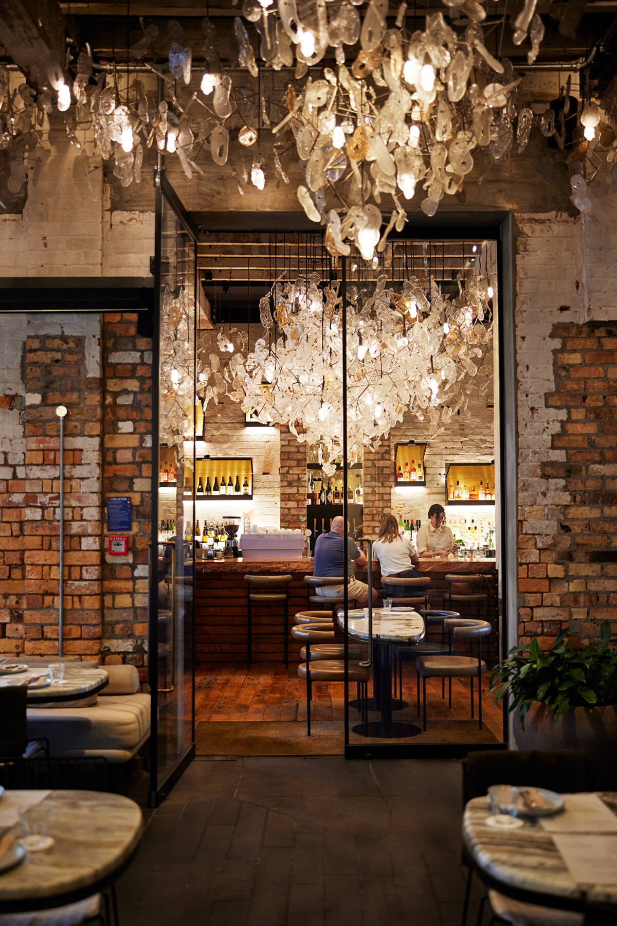 歴史的な建物を改装し建てられたホテル・ブリトマート内にあるキンギ。西オークランドの作家が手がけた吹きガラスの照明が美しく煌めく。