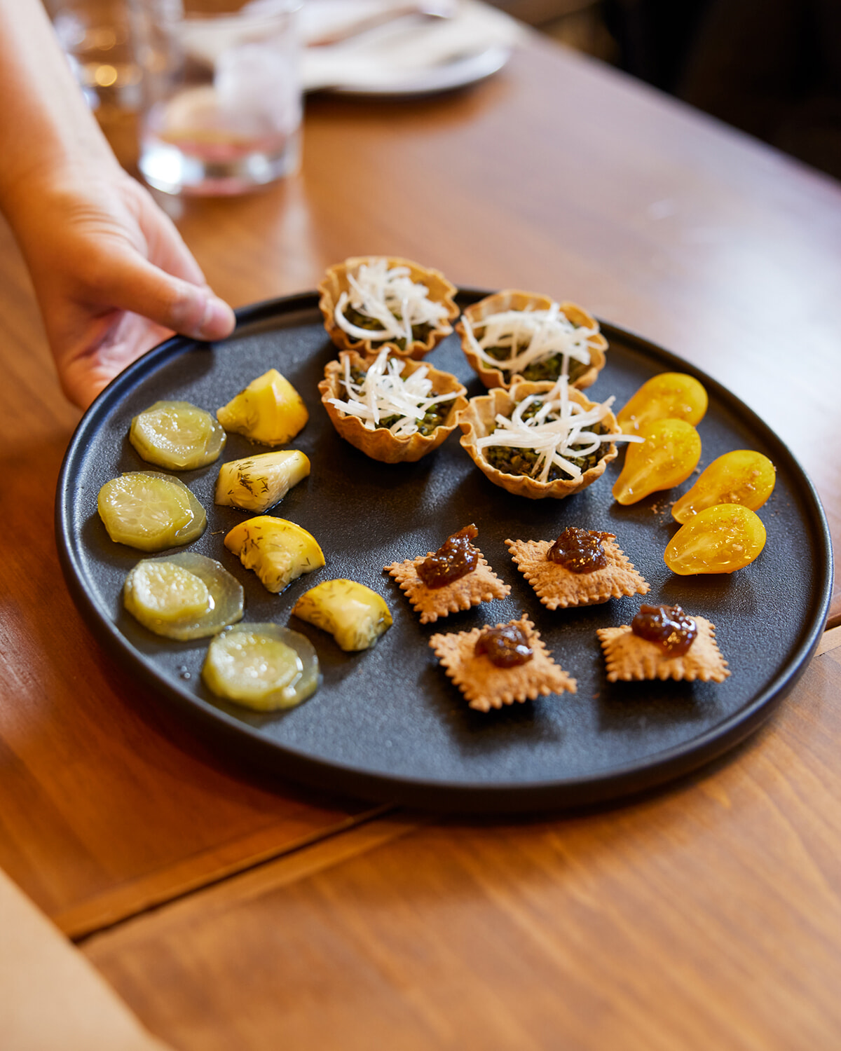 スターターは、自家製のピクルスやチャツネを組み合わせたスナック。酸味と甘味のバランスが食欲を増進させる。