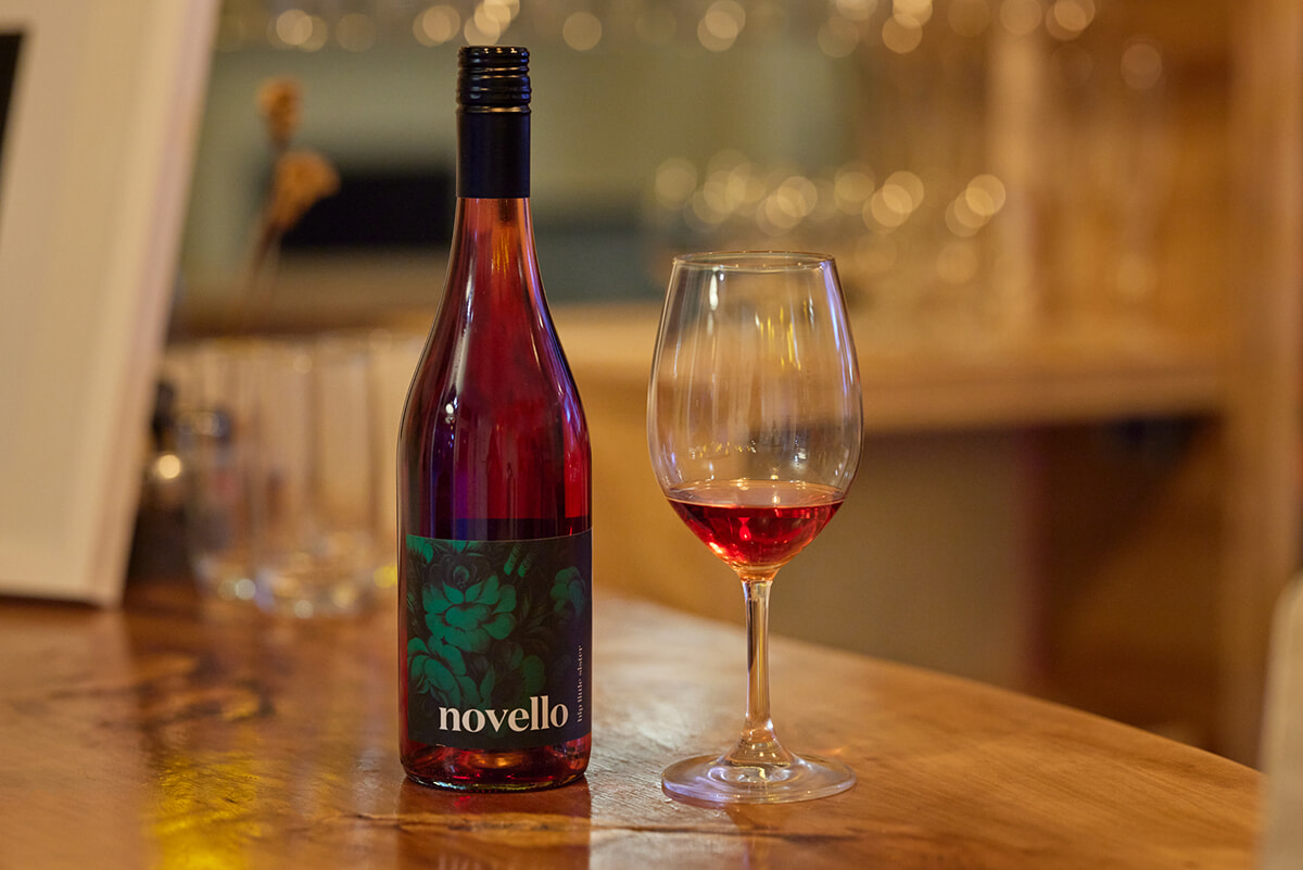 ヒルサイド・キッチン&セラーの料理に向けて北島マーティンボロのワイナリー、ビッグ・スカイが手がけたという「Hip Little Sisters Novello 2023」。「イチゴのような果実味。最後にギュッとした苦みがアクセントに」(平野)。ワインはリストからオーダーすることも可能。