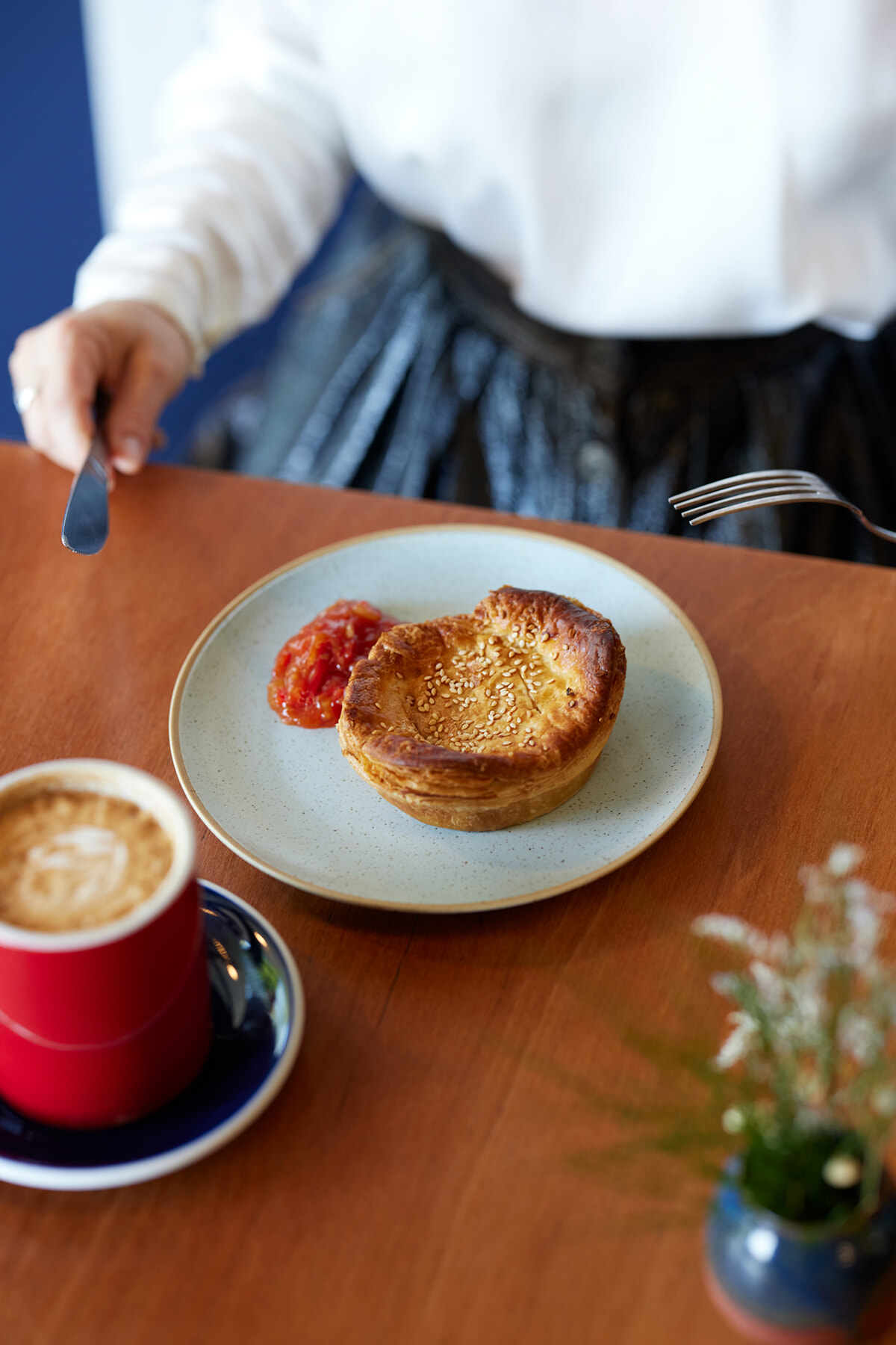 「Beef Bourguignon」(9.5NZドル)。さくさくのパイ生地と濃厚なブフ・プルギニヨンの組み合わせはワインにも合いそうだけど、ニュージーランドらしくフラットホワイト(4.5NZドル)とともに。