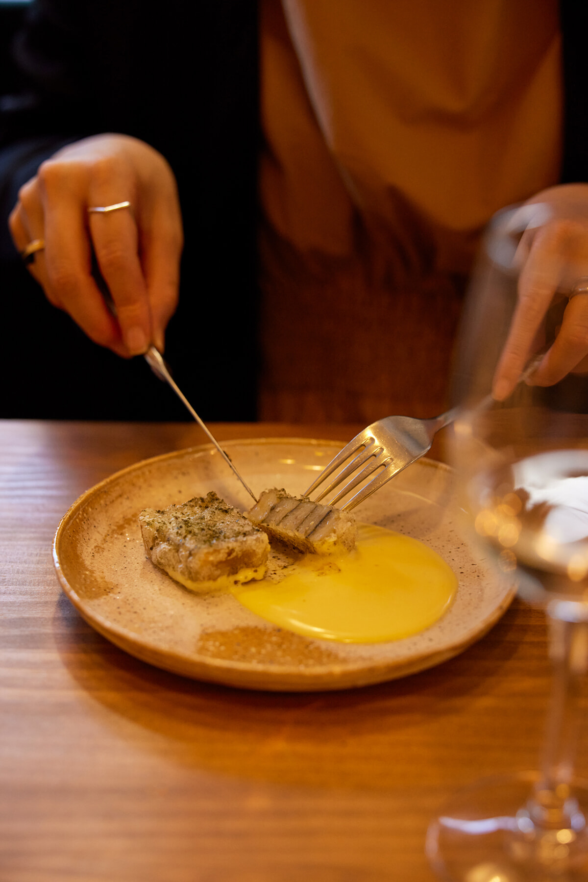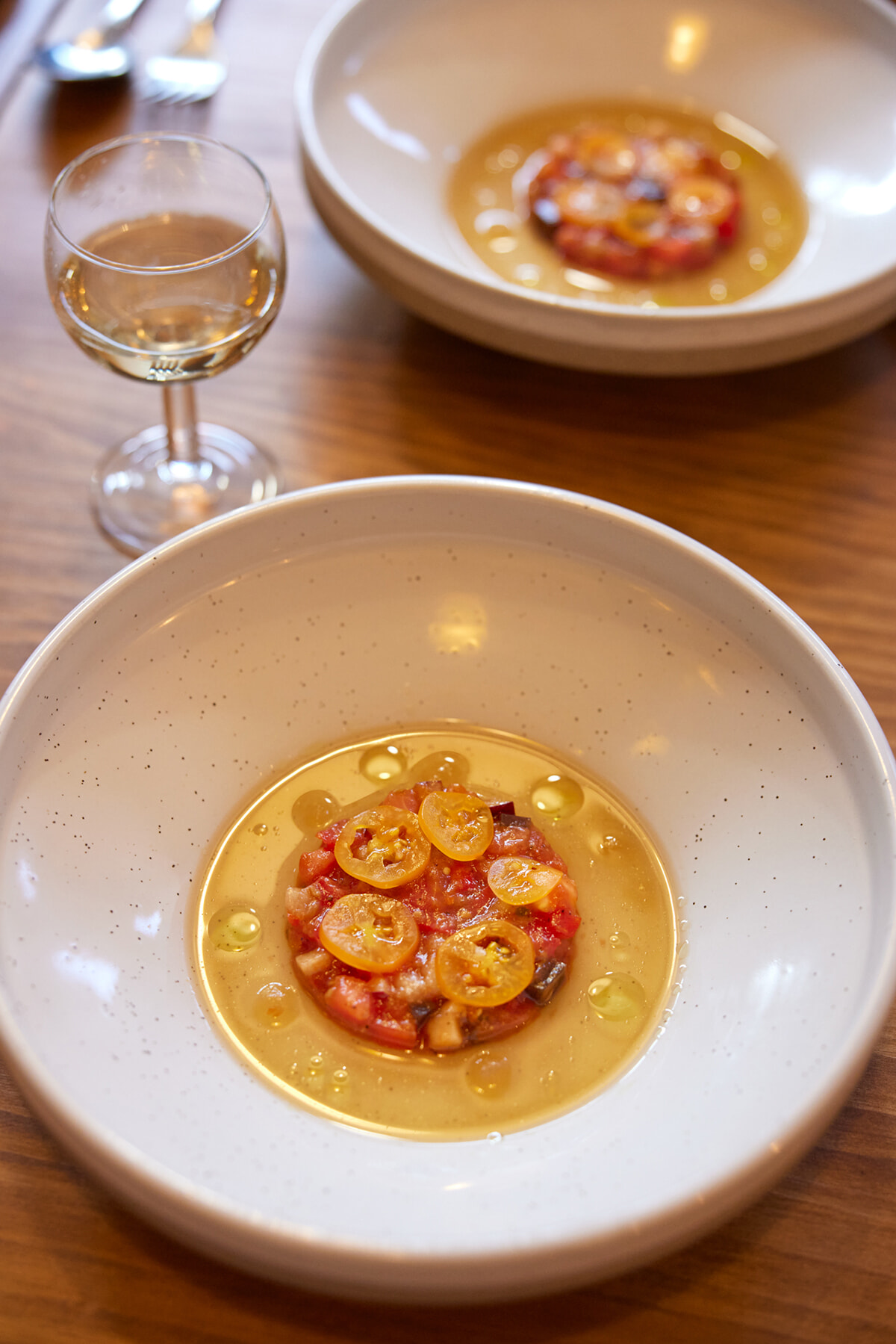 メニューは野菜中心でコースのみ。どのお皿にも食感や味わいの奥行きがあり、驚きが詰まっている。たとえば前菜の「Tomato」は、6〜7種類ものトマトをハーブ、スパイス、コンソメなどで味付けし、タルタルのように仕上げた一品。さまざまな色のジャガイモを重ねた「Potato Fritter」は、外側はカリッと揚がり、中はしっとりほっくり。ポテトフライのジャンクな楽しさを生かしながらも全く新しい姿へと昇華している。メニューを引き立てるうつわもオーナーが作っているというから、ひと皿ひと皿にかける想いの大きさが伝わってくる。