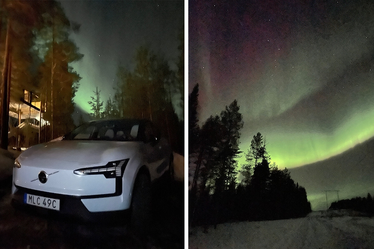 春が近づき日が長くなりつつある美しい夕日にボルボが映える。2日目はオーロラにも遭遇し、ノルディックトワイライトやオーロラなど、車内に搭載のアンビエントテーマのイルミネーションを連日にわたり実感できた。