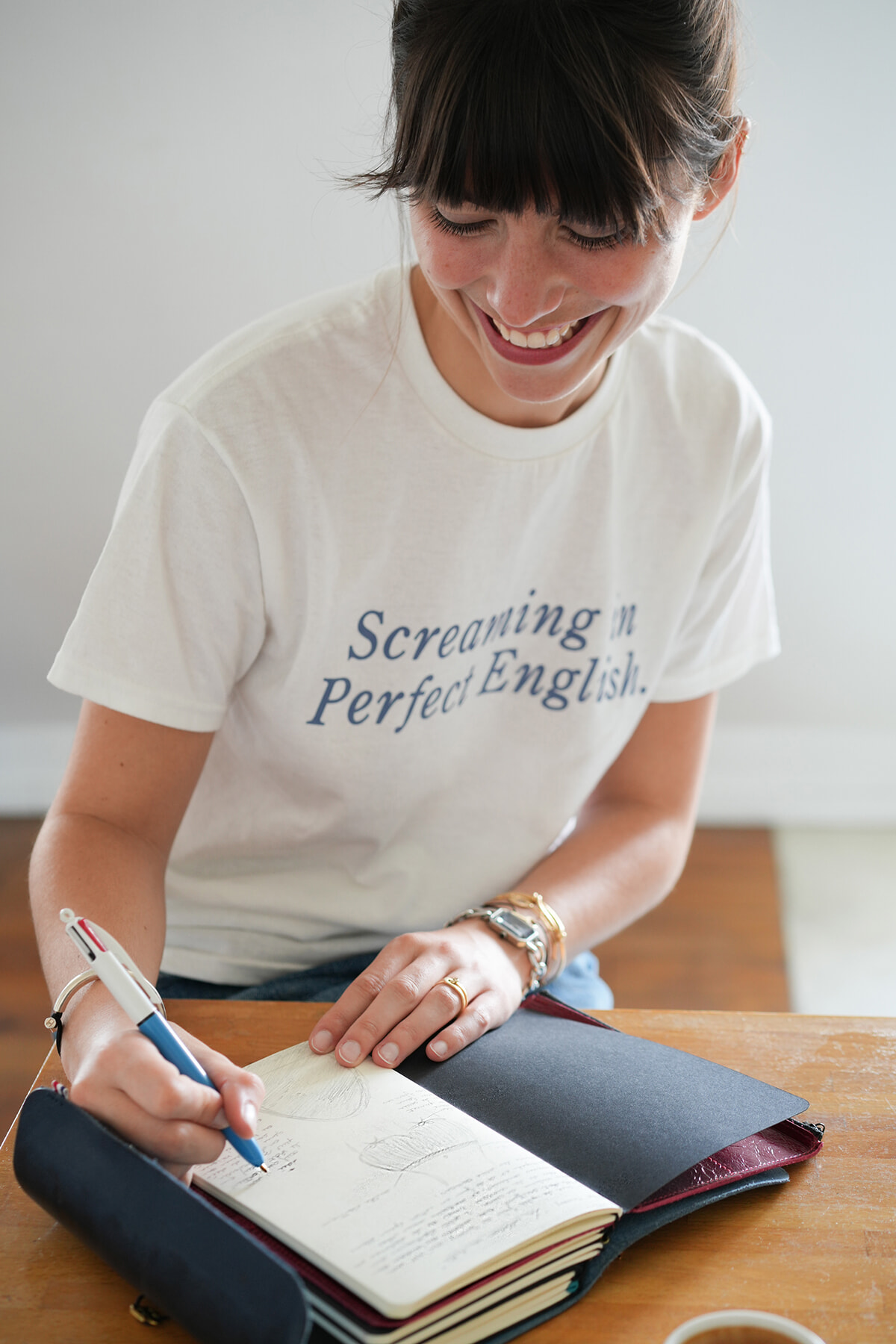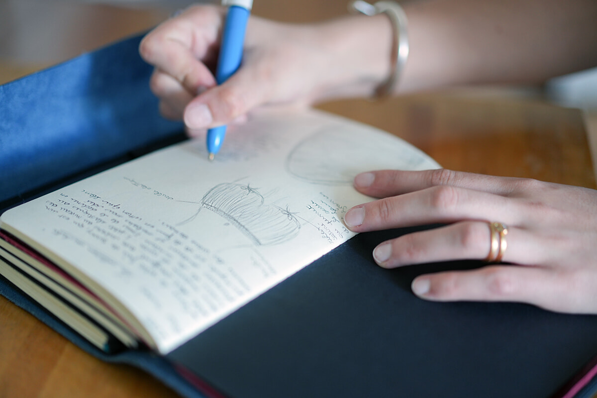 ブルーグレーのレザーカバーに自身のイニシャルを入れてカスタマイズした、ルイーズ・カルメンの手帳が手放せないと言うジャンヌ。スケジュール帳ともう一冊、無地のノートには新たな下着のアイデアを書き留めたり、デザイン画を描いたりとなんでもメモ! デジタルな時代でも、やっぱり⼿帳は⼤切な相棒。