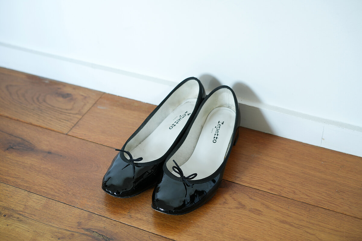 レペットのバレエシューズは何⾜も履き続けているほど、お気に⼊りのアイテム。今回は3㎝ヒールのブラックエナメルを新たに購⼊した。カジュアルなデニムにもドレスにも合う万能な⼀⾜。