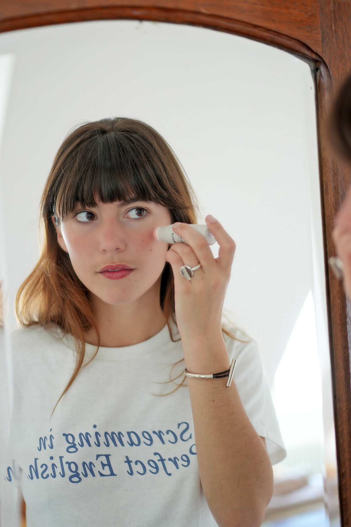 メイクアップのポイントは、頬に丸くチークを⼊れること。「最近のお気に⼊りはゲランのクリエイティブディレクターも務めているメークアップアーティスト、ヴィオレットが⽴ち上げたVioletteのビズ・ブラッシュ。マットクリームのスティックタイプで、テクスチャーも⼼地いいの。色はピーチピンク系のイネスが好み。薄いオレンジ系のメラニーと使い分けています。付属のブラシでぼかすと自然な血色感に」