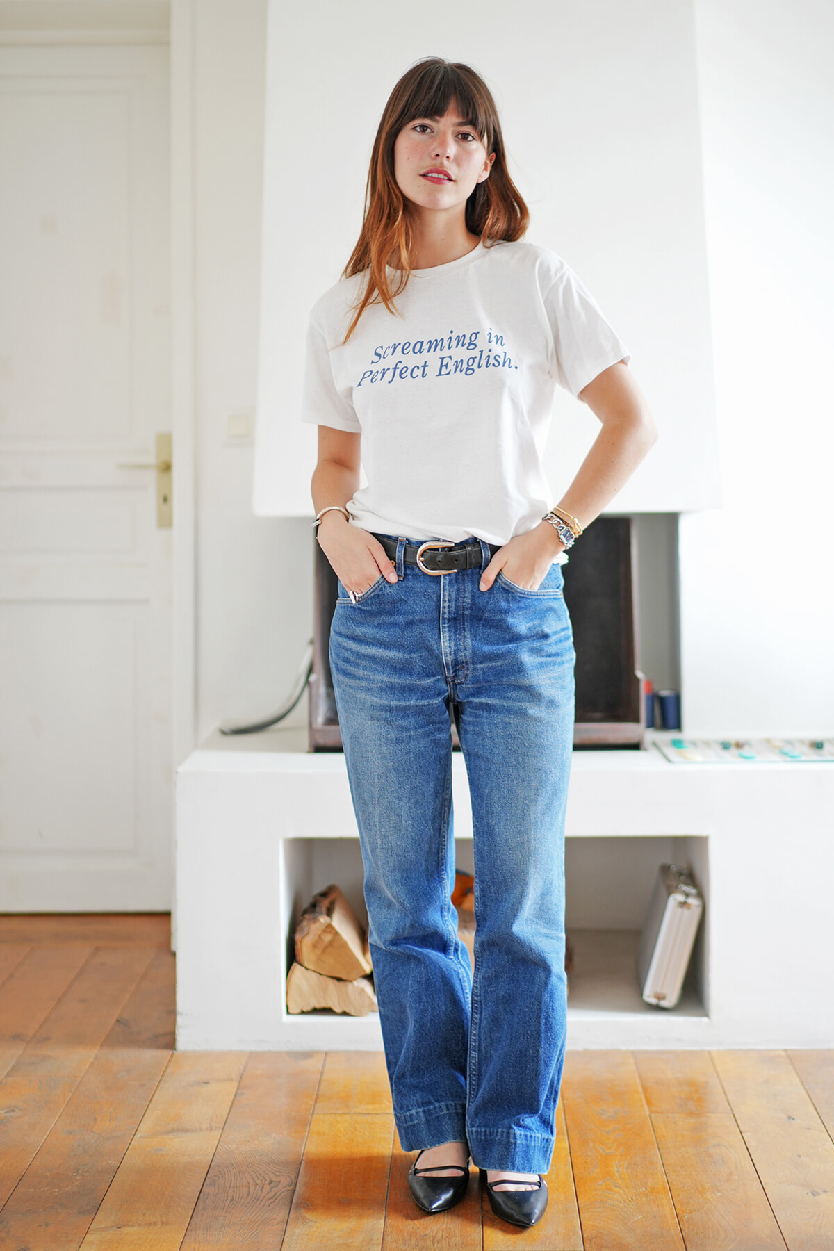 「海の街、ビアリッツで生まれ育ったからか、無地やボーダー、ロゴ入りのTシャツとデニムというカジュアルなスタイリングが好み」と言うジャンヌ。特にTシャツが⼤好きで、今回身に付けているのはロンドンブランドのコービン・ショー。ビアリッツにあるサーフショップでもロゴ⼊りTシャツを⾒つけては購入し、ボーイフレンドとシェアしているそう。ボトムはヴィンテージのリーバイス®︎が中⼼で、真夏にはカットオフしたデニムのショートパンツでラフに仕上げるのが定番。