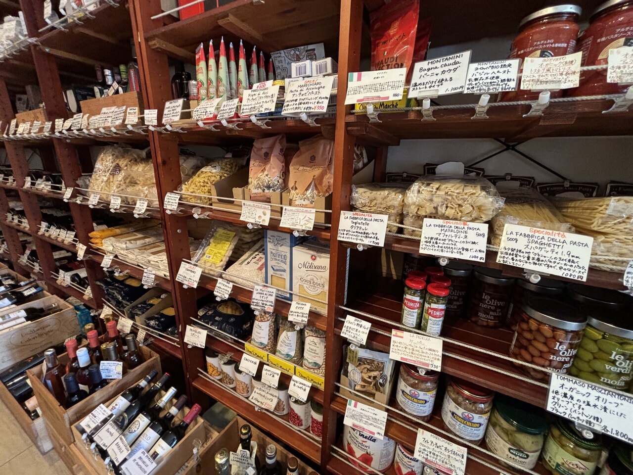 店舗に入ると、右側には冷蔵のショーケースが鎮座。フィレンツェで料理を修行した喜子さんの手がけるトスカーナ州名物のトリッパをはじめ、オリジナルの肉料理やニョッキ、冬には豆料理などのデリ、またスライサーで極薄に仕上げる生ハムなどを購入できる。対面の棚にはパスタやトマトペースト、オリーブなどのイタリア食材が。「料理人のフィルターを通した、自分でも使う本当に好きな食材を置いています」と喜子さん。