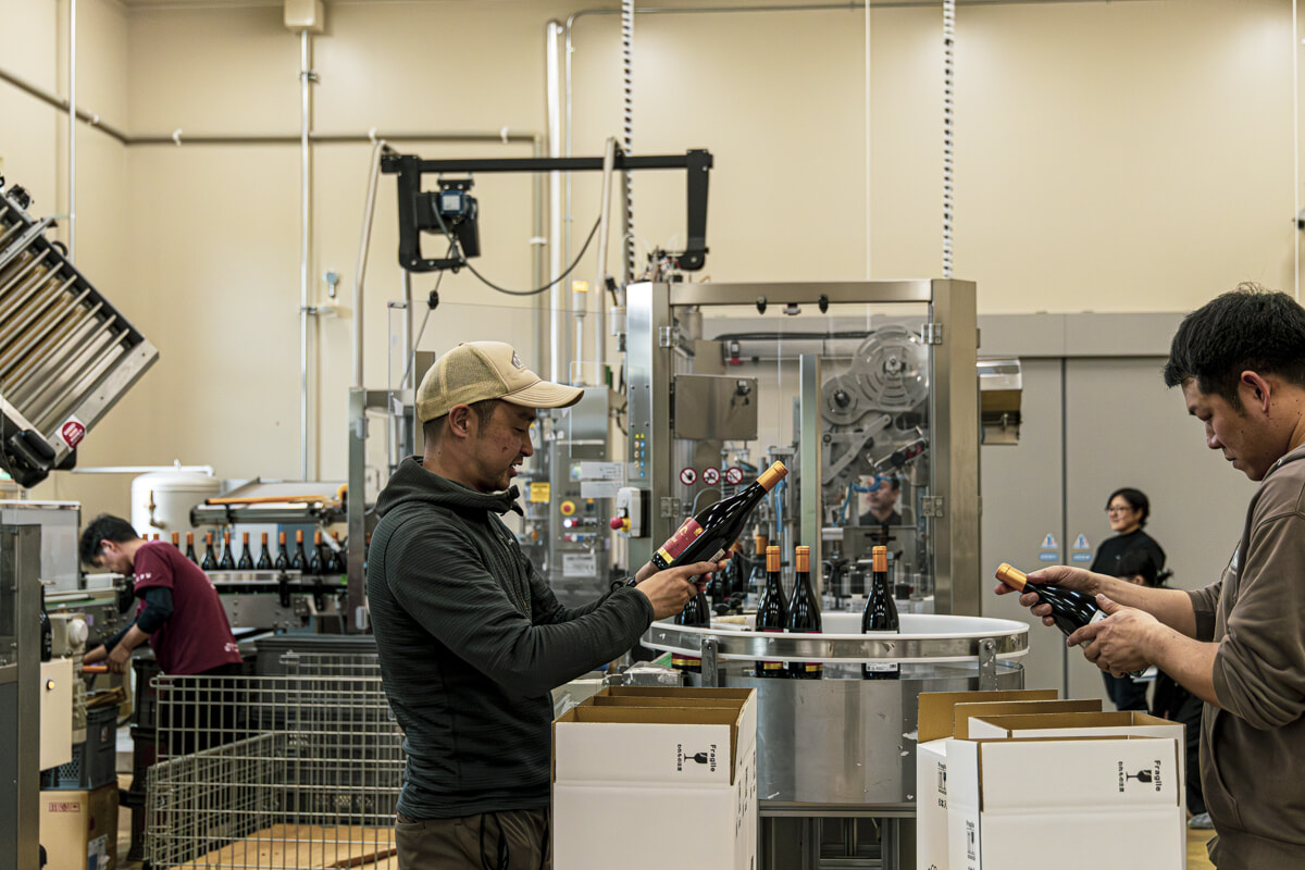 ボトリングからコルク封入、キャップシール、ラベリングの作業はすべてベルトコンベアに乗せられ機械で行う。最後にスタッフの目視でボトルをチェックし、箱詰めへ。余市のワイナリーから、連綿と受け継がれた珠玉のワインが全国へと運ばれていく。