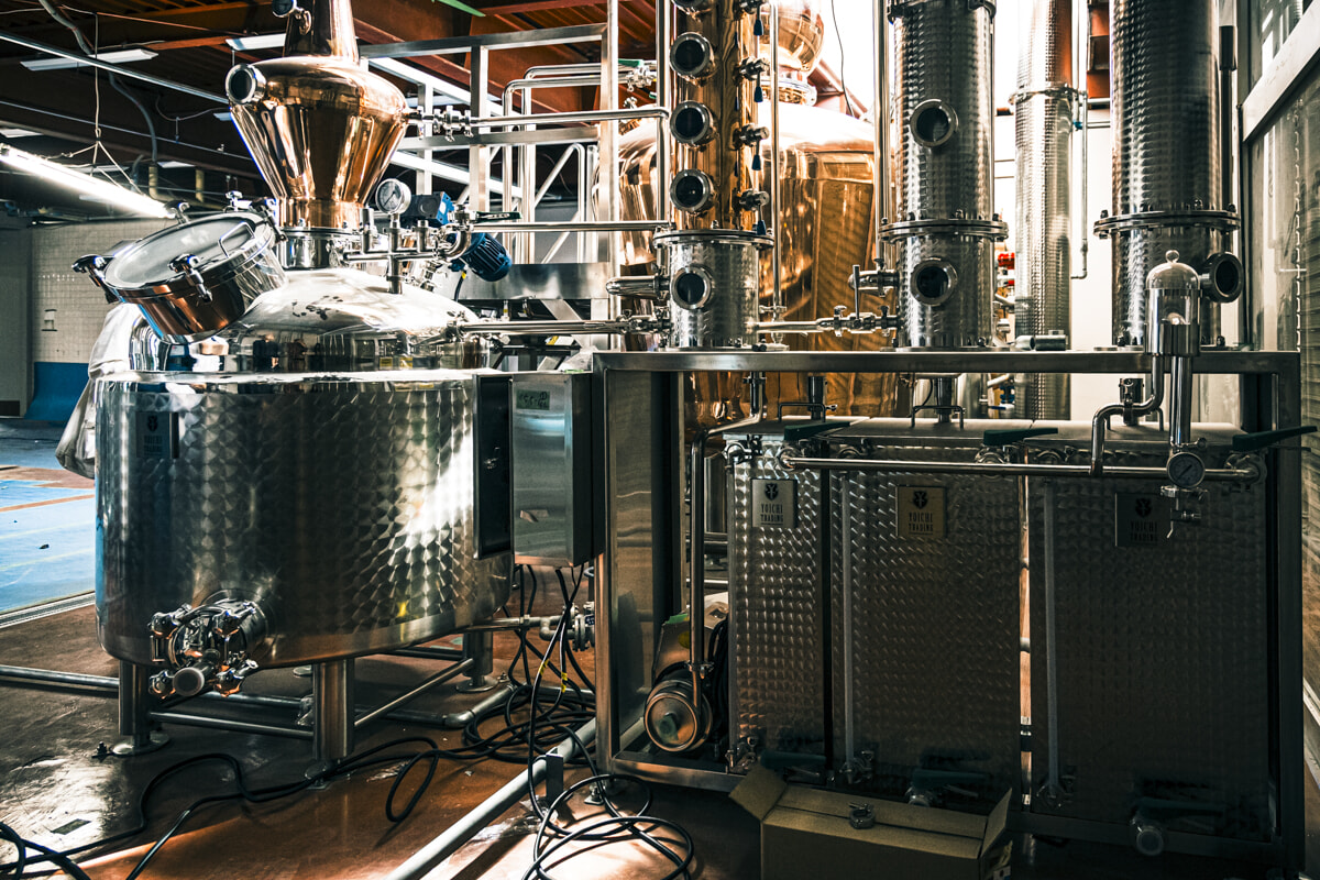 その取り組みはワインだけにとどまらない。「ワインを造る際、ブドウの絞り滓がどうしても発生します。これをどうにか利用できないかと思っていたのです」と誠人さん。余市を流れるヌッチ川の畔にあった元農協施設を再利用し、ここでぶどうの絞り滓から蒸留するグラッパ(=マール、ブランデー)造りを行う蒸留所を稼働させることに。醸造機器のメーカーにいた経歴を活かし、設備のデザインは誠人さんが自ら手がけた。