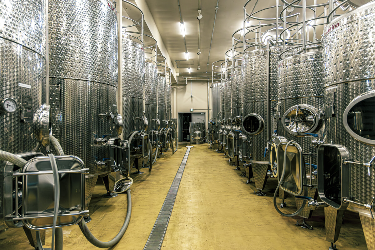 1シーズンの収穫で100〜120トン、瓶詰めすれば10万本以上になるキャメルファームワイナリーの醸造設備は、まさに近代的だ。いちばん大きなタンクで8000リットル、巨大なタンクが整然と並ぶ。