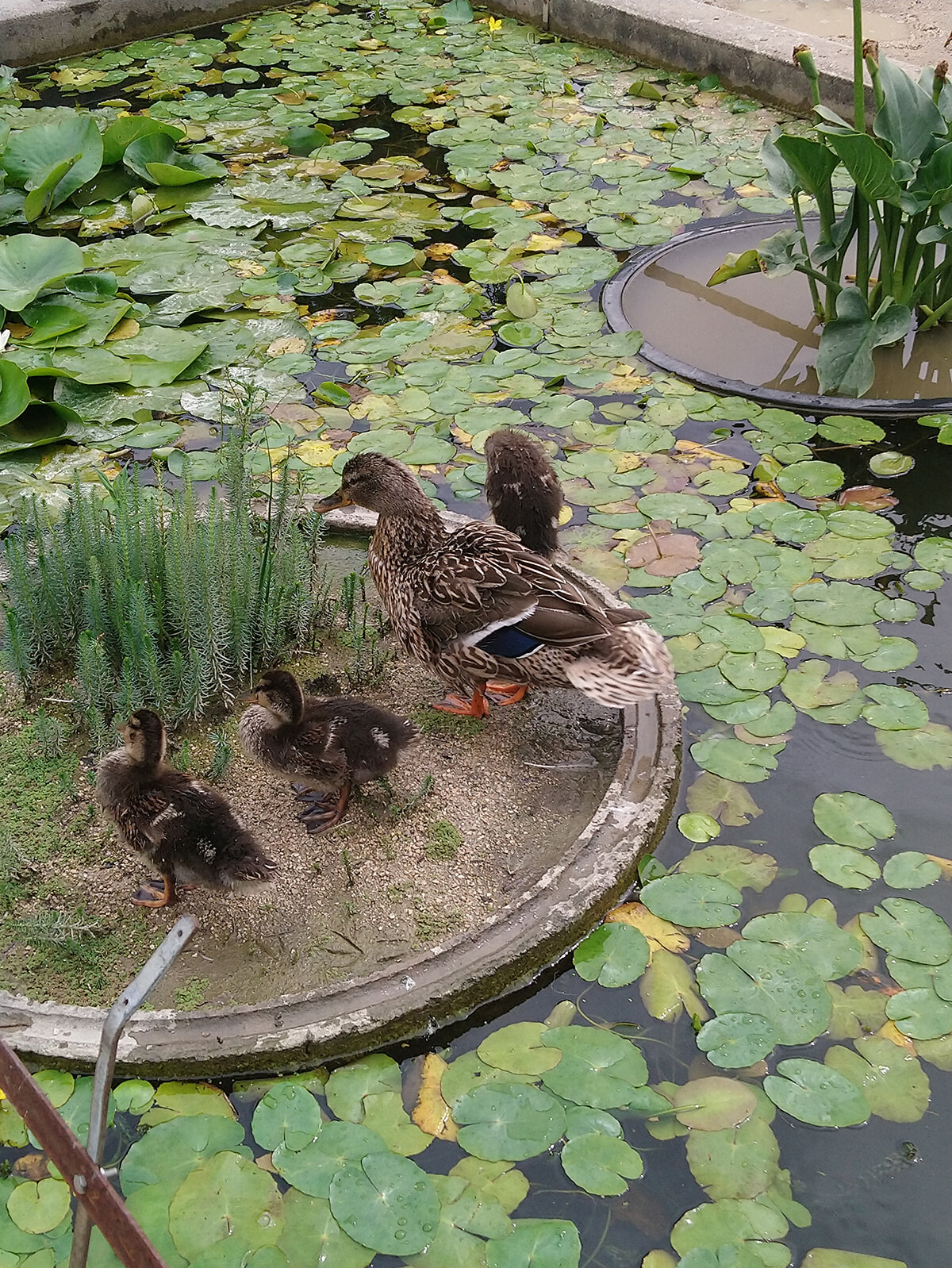 親子の行進が微笑ましい、この春に生まれた鴨の子供たちは、お母さんと一緒に泳ぎの練習中。