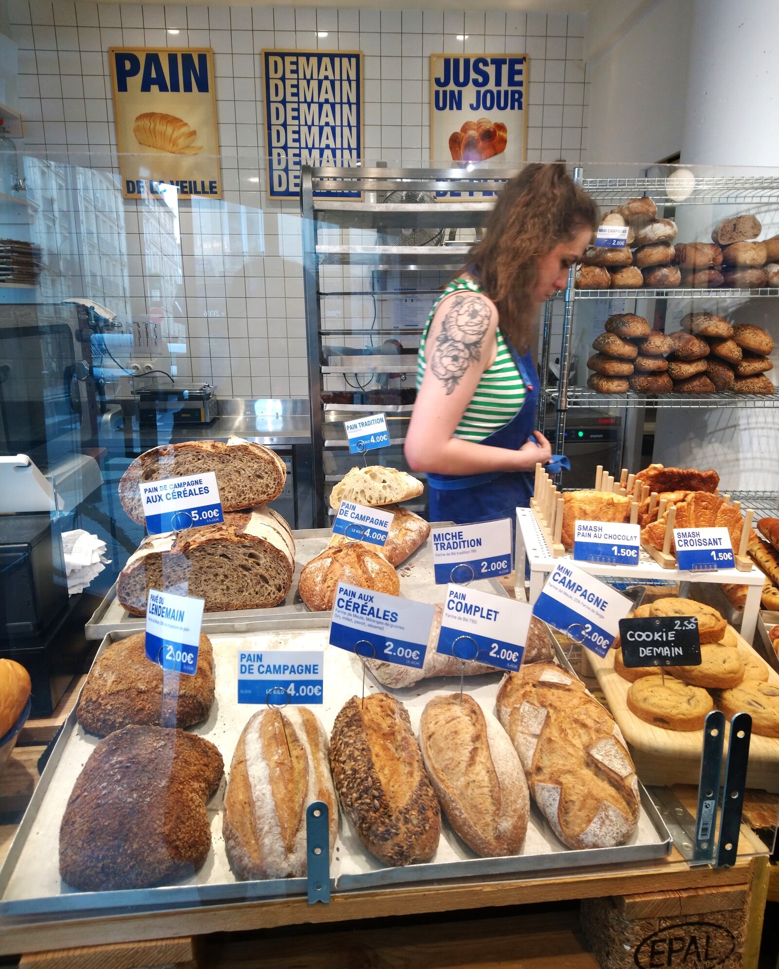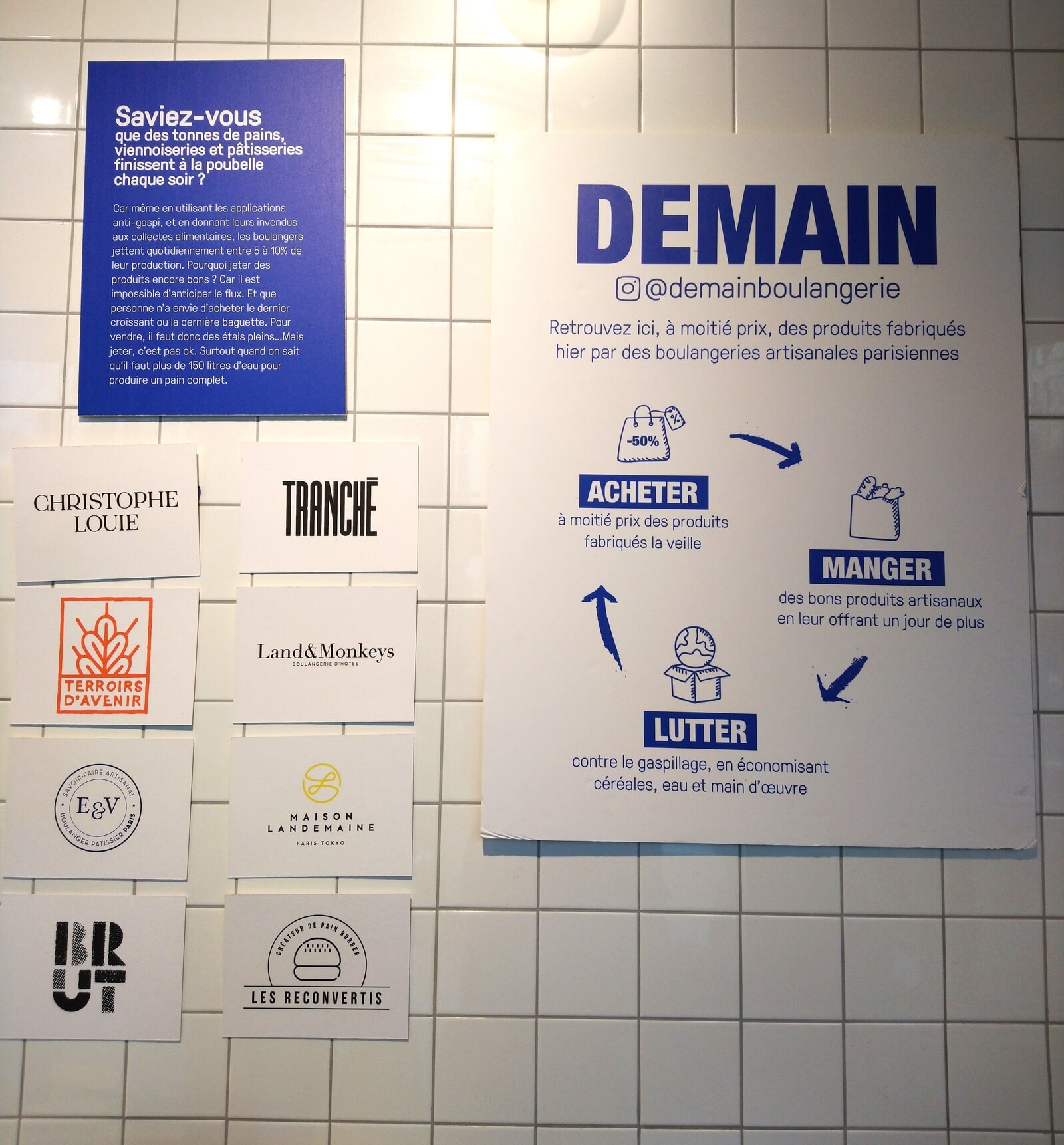 天然酵母を使って、じっくりと発酵させたものだけを扱っているのですが、職人たちによって真面目に昔ながらの方法で焼かれたパンは、時間が経っても味わい深いものです。店の壁にはコンセプト、協賛しているブーランジェリーのマークと”あなたは、毎晩何トンのパンやお菓子が捨てられているか知っていますか?”という問いかけから始まるメッセージが。