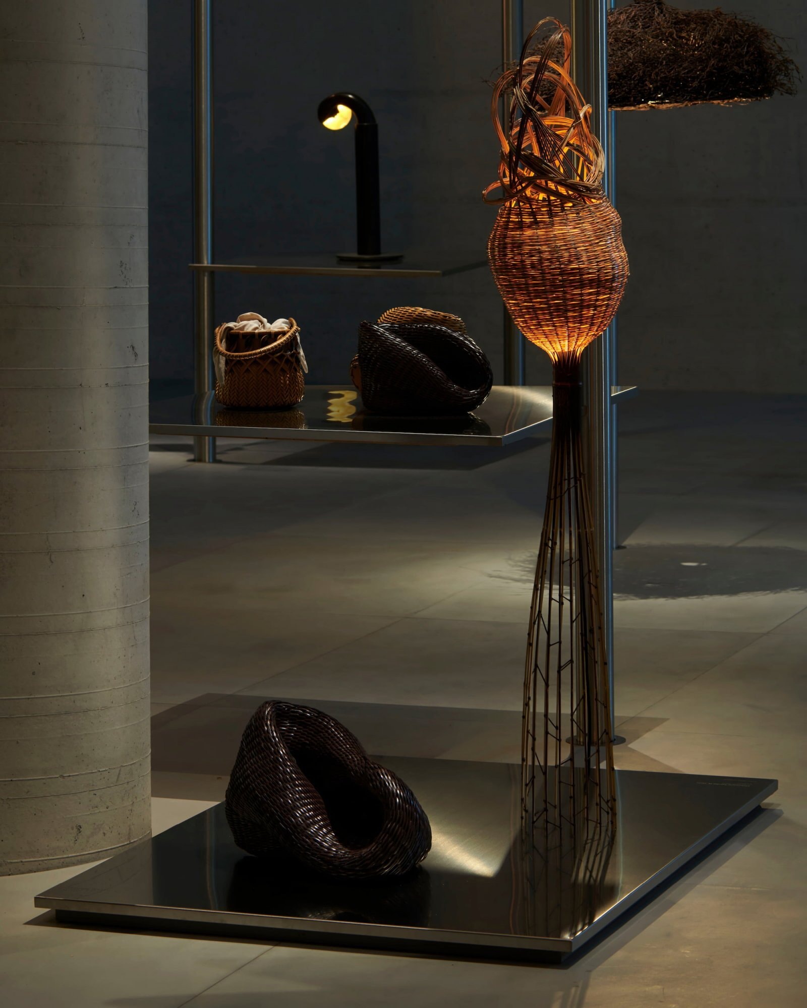 『ロエベ ランプ』展の会場となったパラッツオ・チッテリオには、竹工芸家や陶芸家、美術家といった、表現手段を異にする作家たちが手掛けた竹やセラミック、ガラス、レザー、さらには馬の毛、灯りすらも素材として取り込んだランプが展示された。