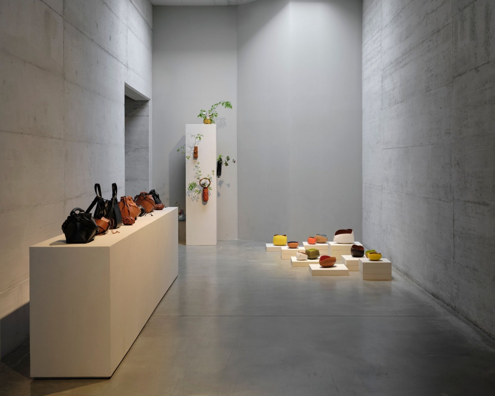 ランプだけでなく、作家たちがロエベの工房とコラボレーションした商品も発表。松本破風(写真左・台の上)、ケイ・セキマチとのコラボレーションバッグはオンラインと日本のカサロエベで6月下旬より展開予定。