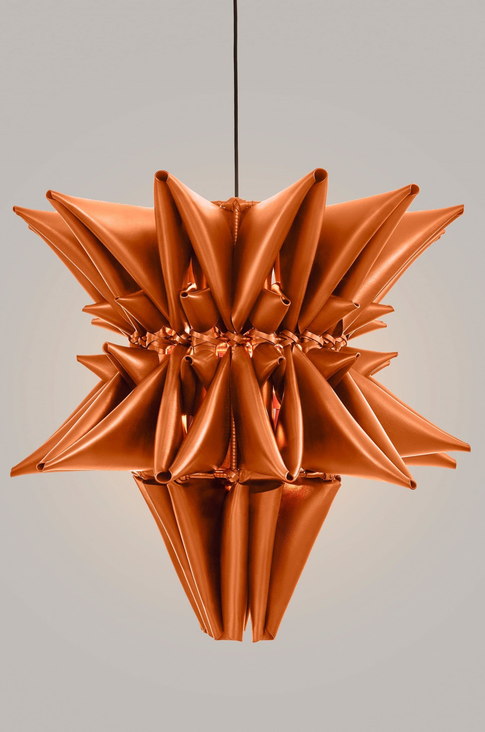 アフリカ・ケニア出身の陶芸作家による星をイメージしたランプ。自身の創作においては土を用いた陶器を制作するオドゥンドは、ロエベの工房を訪れ、バッグ「ハンモック」に見られるしなやかなレザーを自在に丸めて折りたたむ職人の技に魅了され、自身で制作するのではなく、ロエベの職人の技を取り入れることを考案した。職人との対話を重ねて生まれたランプは、たたんで先端をとがらせたレザーのプリーツの隙間からこぼれる光が幻想的。灯りのない時はそれ自体が彫刻のようだ。